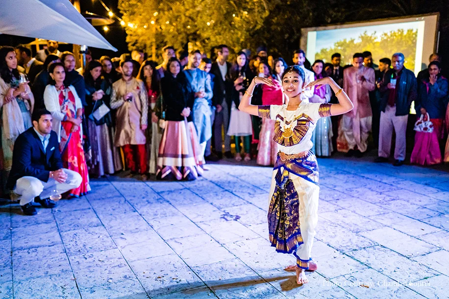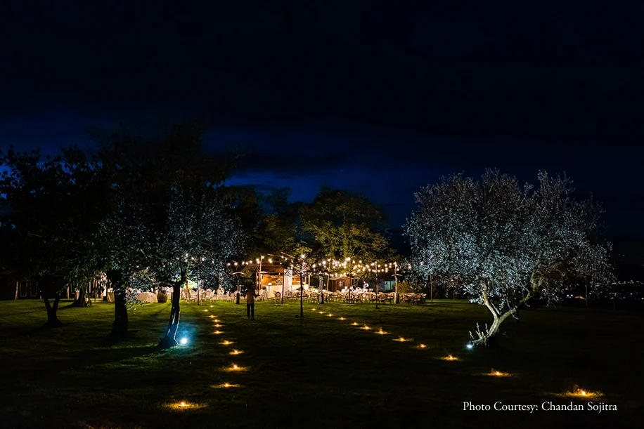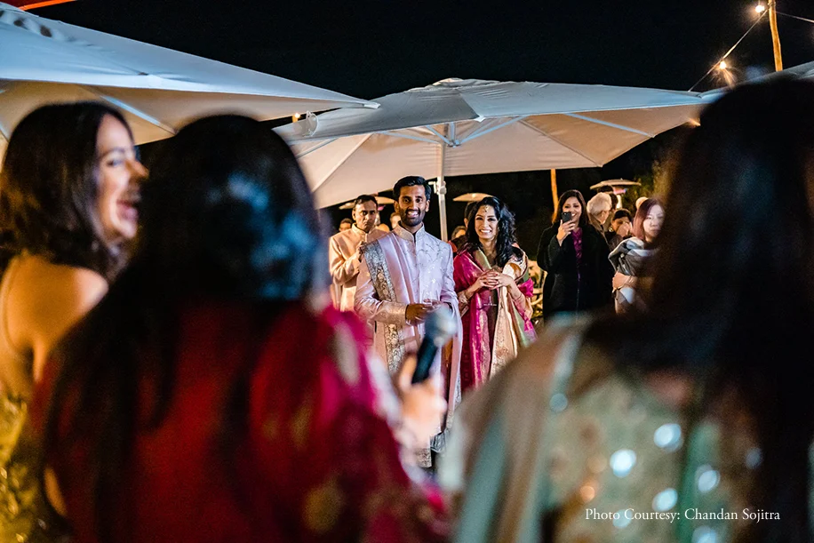 The sangeet was a charming outdoor event with warm ambient lighting and abundant greenery. The bride shares, “We wanted this to be a special introduction for our guests who had travelled from all over the world to celebrate with us, and to be a chance for old friends to catch up. So we ambitiously planned an outdoor event starting off near the outdoor pool and gardens with a local Italian band and rustic Italian finger food. We then moved to another outdoor area with the DJ, dance floor, bar and seating, where we served an open buffet with various food stations of local Italian and Indian food.” The evening saw heartwarming speeches, dance performances by the couple and their loved ones, and dazzling fireworks. DJ Kabir of Kudos had everyone on the dance floor for the whole evening.