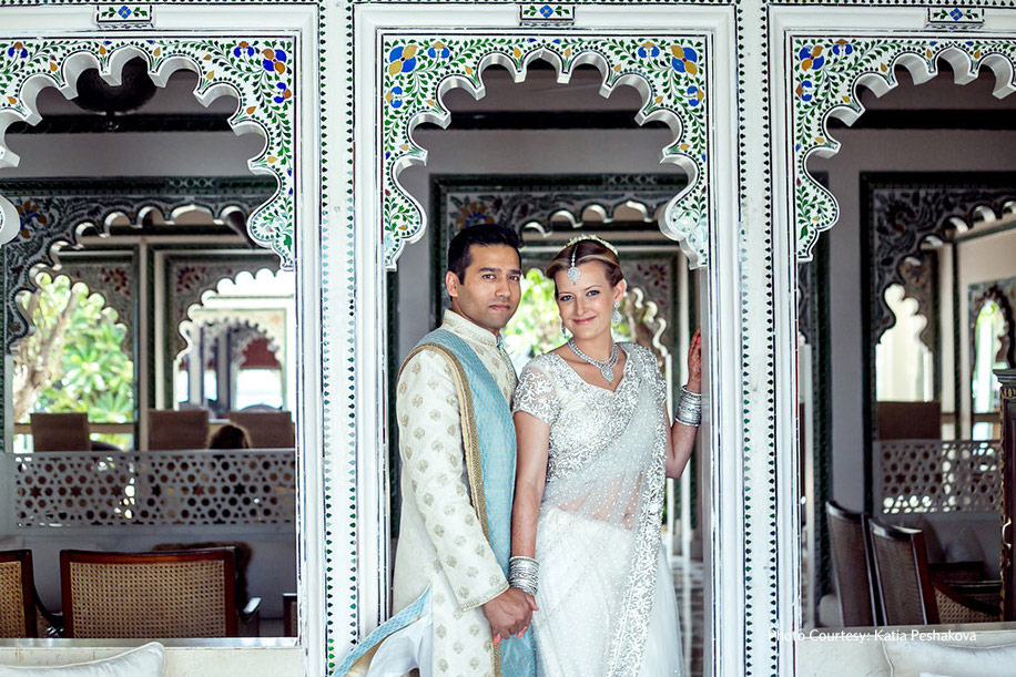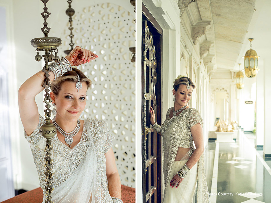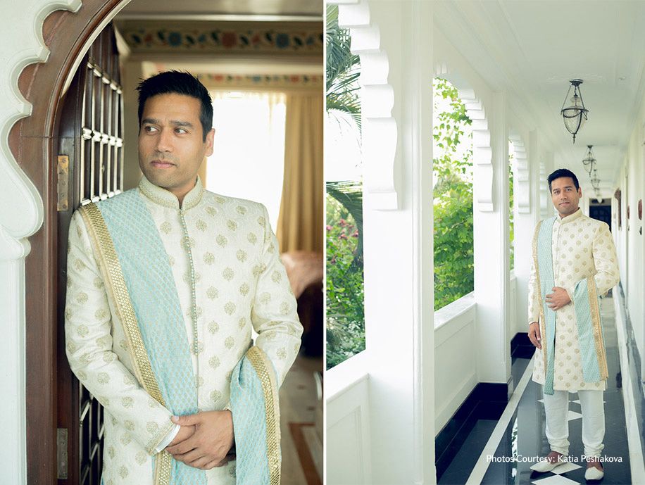 “The sunset pheras were held on the rooftop overlooking the serene Lake Pichola. The mandap was vibrant with garlands of marigold blooms which looked lovely against the white marble of the environs. The story of what we wore for our wedding is a rather interesting one. We bought our outfits only two days before our wedding in Mumbai en route to Kachhiawadi. After creating a mood board on Pinterest, we went out on a hunt and source mission. We found a fantastic local taxi driver who took us them to all the best boutiques. My sari was a nod to the traditional Western white gown with some sparkling details which we purchased from Basuree. Anup donned an off-white sherwani by the fantastic team at Telon which matched the color of my outfit.”