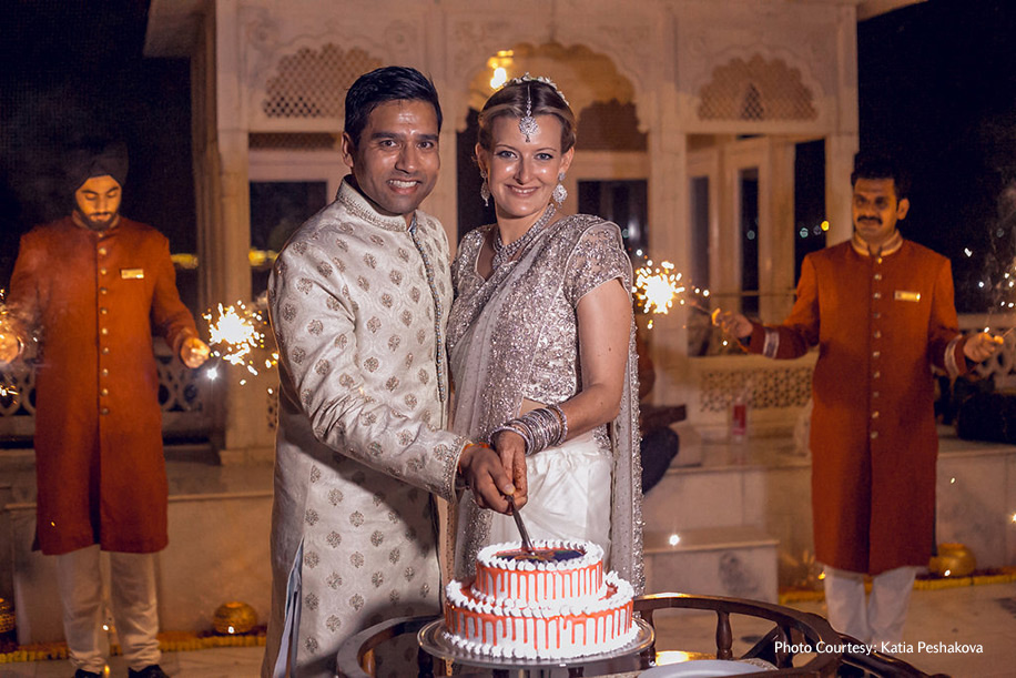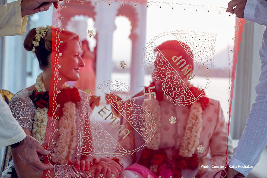 “Anup’s Gujarati heritage and my love for everything Indian meant that the obvious destination choice for our wedding would be India. The lead up to our wedding started with a party in Kachhiawadi which was hosted by the Anup’s parents for the entire village to celebrate the marriage. It was so heartwarming to see this kind of hospitality and the bond that his family had maintained with their roots despite being away from their homeland. The rest of the ceremonies were held at Taj Lake Palace in Udaipur, Rajasthan. The hotel’s links to its glorious past, arresting views and the beguiling architecture made it our number one destination to get married at. We wanted to have the ceremonies in a picturesque setting. Many guests said that it felt like they were attending a royal wedding.”