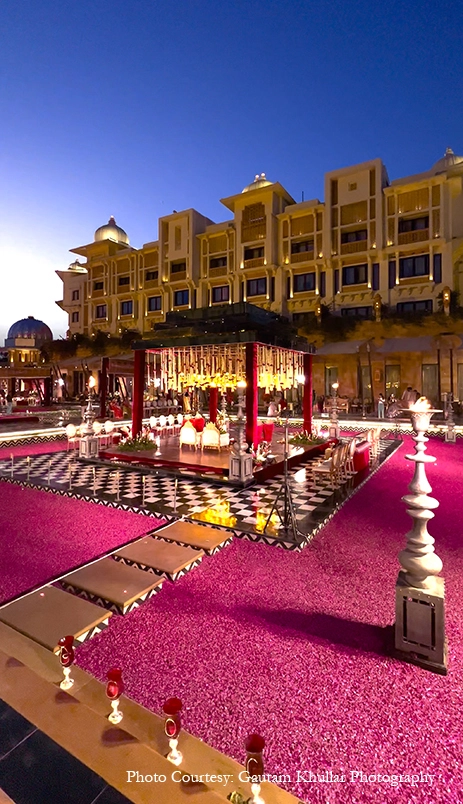 A royal Rajput wedding demanded a venue befitting its grandeur, and Udaipur’s The Leela Palace ticked all the boxes for the couple! Flanked by the beauty of Aravalli Mountains and Lake Pichola, the modern palace hotel evokes the opulence of Mewari heritage ensconced in contemporary luxury, and was the perfect choice for a memorable destination wedding.