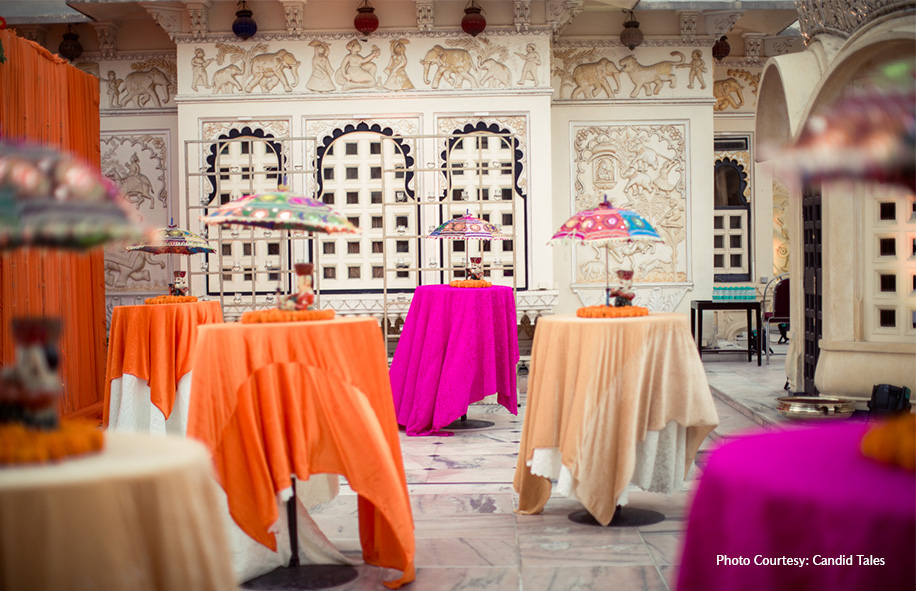 “We wanted our mehndi night to be a fun one, so we decided that the event would have a ‘Shades of Marigold’ theme. This was the perfect opportunity for our decorators to be creative and bring out the essence of Rajasthan with their designs. We decided that the perfect location would be the Pratap Chowk area in the heritage Chunda Palace hotel. The decorations all centered around different shades of marigold blooms.” From the colorful umbrellas on colorfully draped tables to the vibrant floral accents, the function was resplendent with a traditional and vibrant visual appeal.