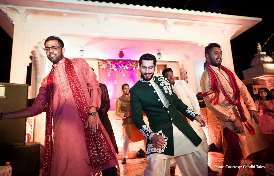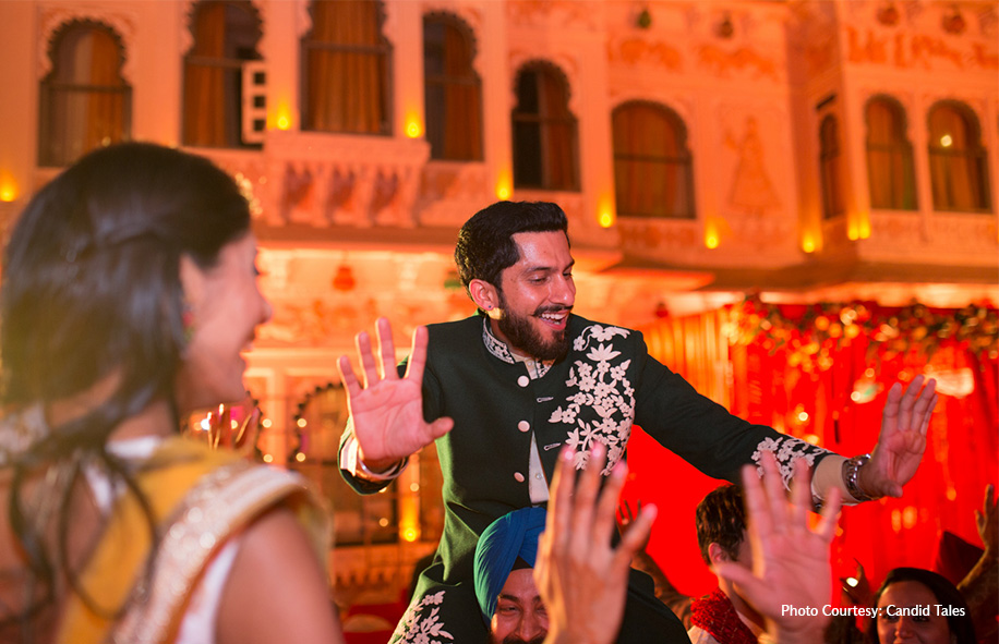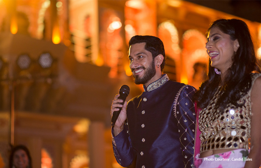 Inspired by the opulence of the Chunda Palace, the couple wanted to recreate a royal experience for everyone. They wanted to showcase the beauty and grandeur of the lovely historic destination for their loved ones. The sangeet function included synchronized dance performances by family and friends as well as singing. The highlight of the decor was the see-through bar façade with hanging puppets. Kimi looked gorgeous in a bright pink lehenga with a floral-print blouse and yellow dupatta, Gagan looked handsome in a black and beige bandhgala outfit with striking white embroidery on the jacket.