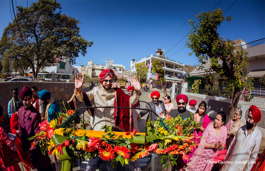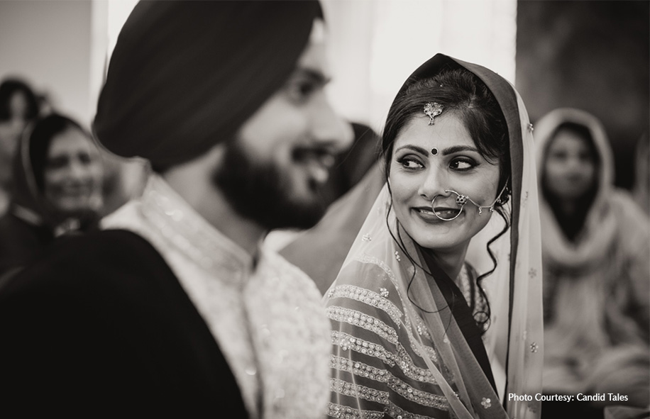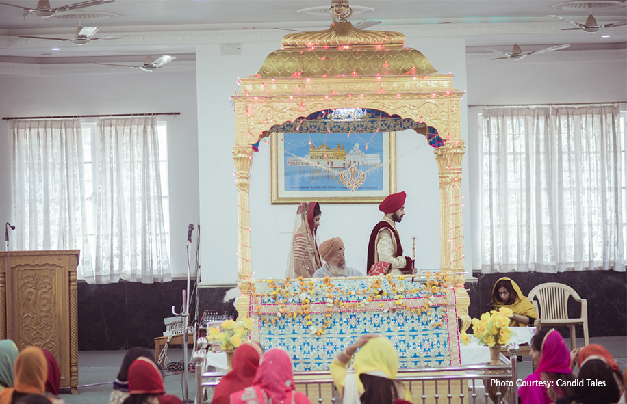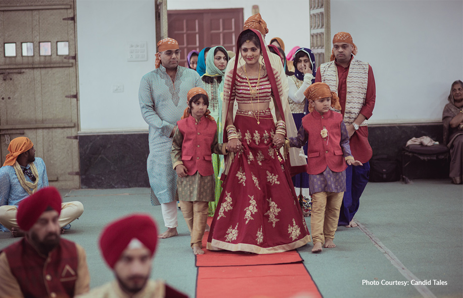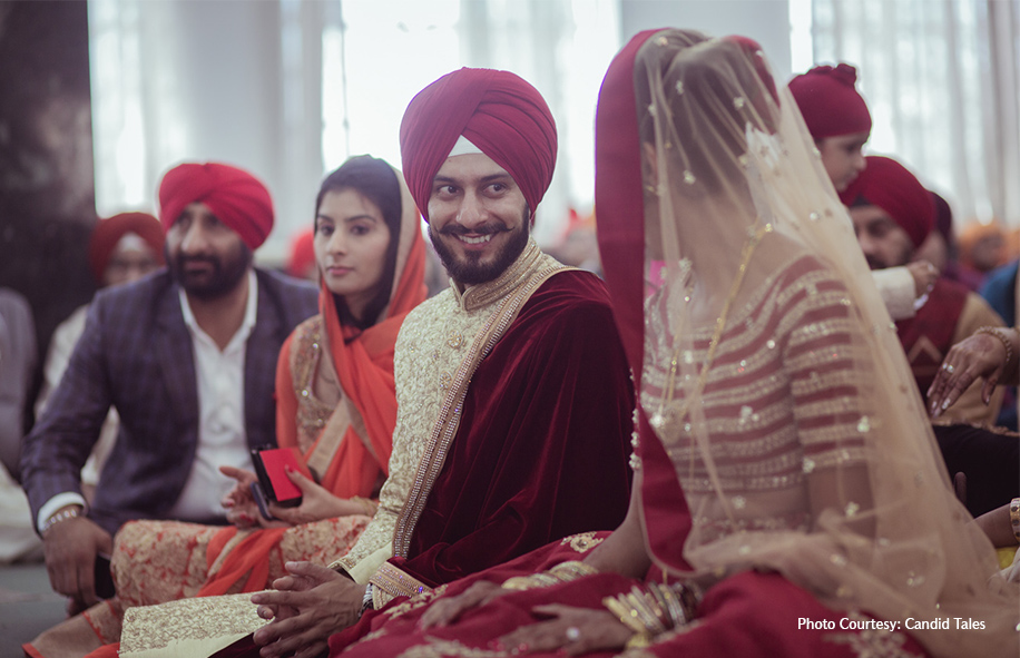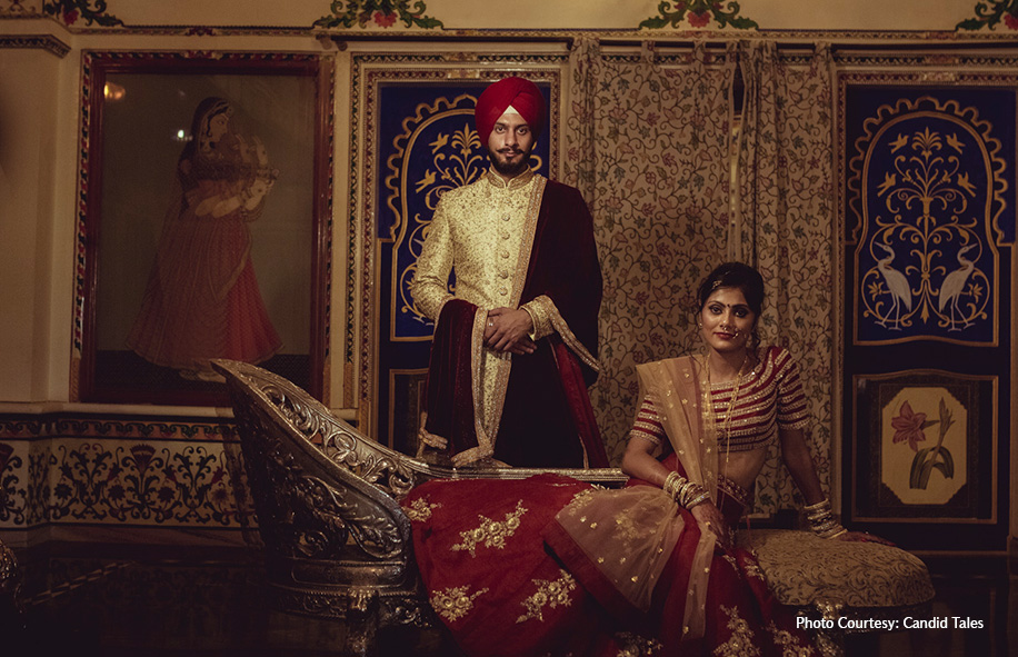 Kimi and Gagan both wanted an intimate Gurudwara wedding with only close family and relatives attending. This ceremony took place at the Gurudwara Sachkhand in Udaipur. The serene vibe of the gurudwara made for a lovely wedding venue and it turned out to be an understated yet sophisticated wedding. The bride wore a crimson and gold lehenga with a matching striped blouse and a net dupatta. She chose minimal gold jewellery such as a small ‘maang tikka’ (forehead ornament) and a long necklace. Gagan wore a beige sherwani and paired it with a crimson velvet dupatta and matching turban with pearl strings that made him look like royalty. The couple was all praises for the photographers who beautifully captured their big day. They share, “Candid Tales did a really good job with our wedding photography and videography. We will cherish these memories forever thanks to the lovely pictures.”