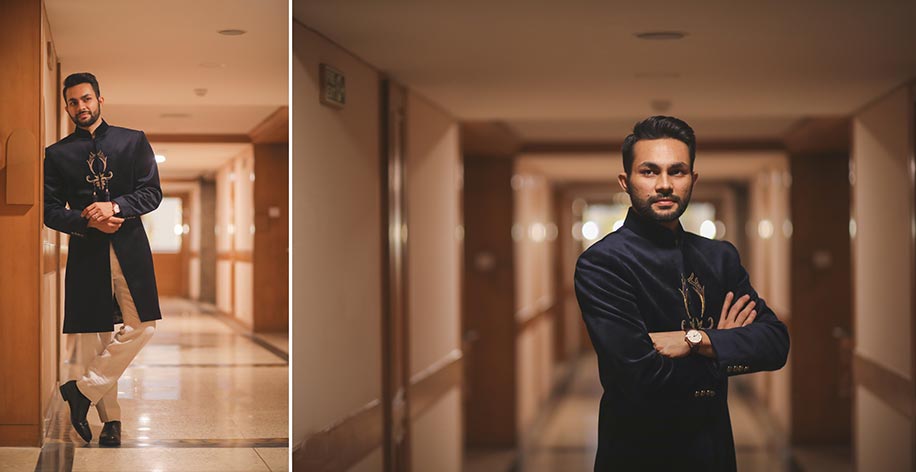“The theme for this event was based on white and gold to create a royal vibe, from the creamy drapes around the mandap to the floral arrangements. I wore a coral red lehenga with beautiful gold embroidery with a net dupatta. Sarfraz cut a fine figure in his black Bandhgala, and he paired this ensemble with a rich gold ‘pagdi’. “