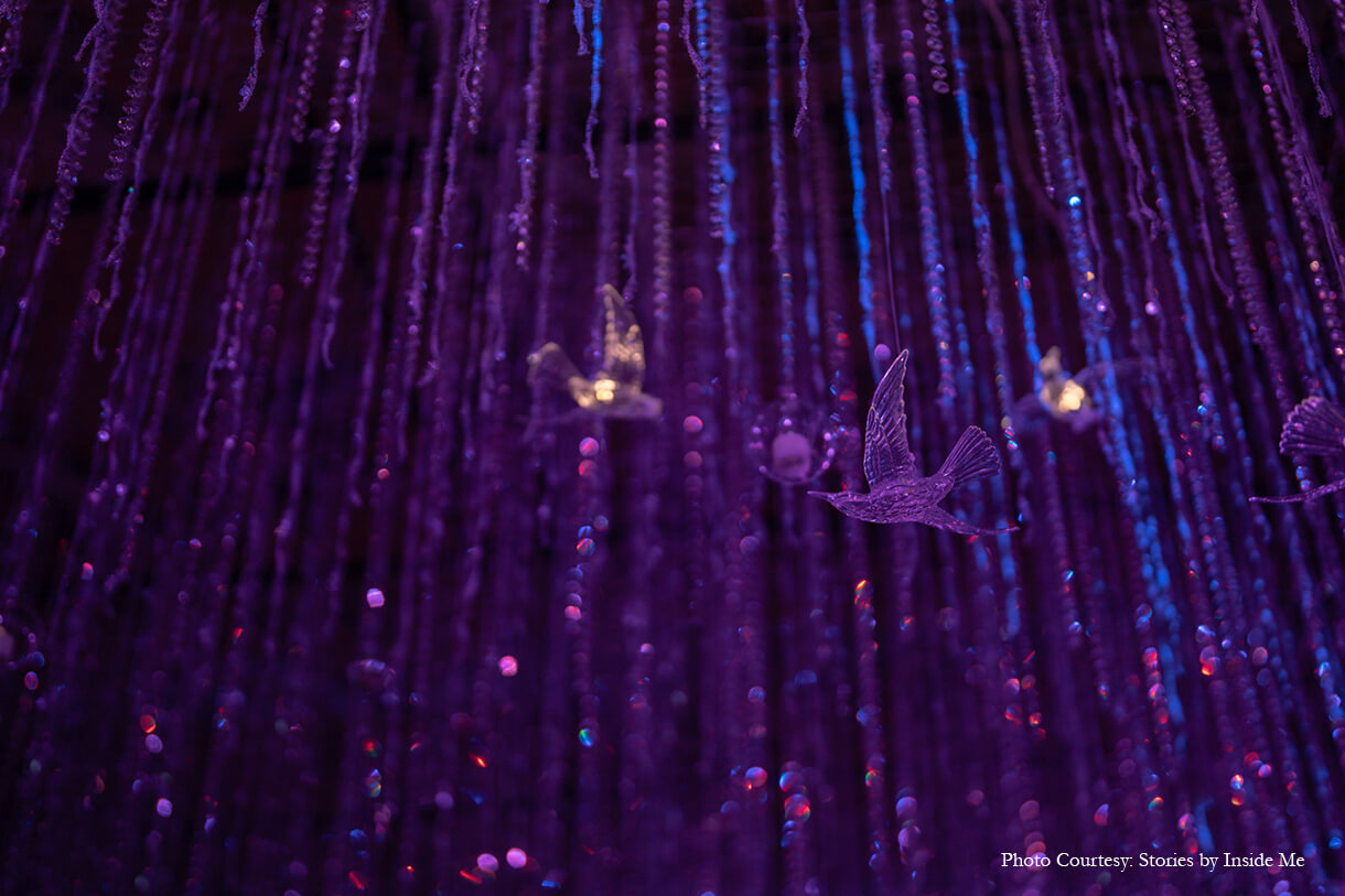 After the breezy, sunkissed events – the couple gave glamour a leg-up with a sage and lavender-hued sangeet. With light purple spotlights that lit up the green walls, the family had a gala time on stage as they danced to Bollywood chartbusters. Meanwhile, the ceiling above looked enchanting with suspended lavender sequins interspersed with acrylic bird-shaped silhouettes.