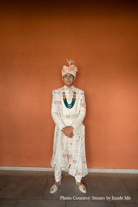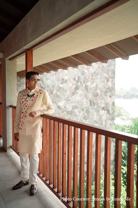 Hosted outdoors by the beach, the wedding was a rustic celebration with twigs, blooms and lush foliage used generously in the decor. The mandap, however, was the highlight of the event with suspended white blooms in sync with the serene surroundings. Nikhil shares, “For the groom’s baraat we had to take special permission from the local authorities. As Yuvraj arrived, the entire road was closed off so that the guests and the groom could enjoy themselves to the fullest.”