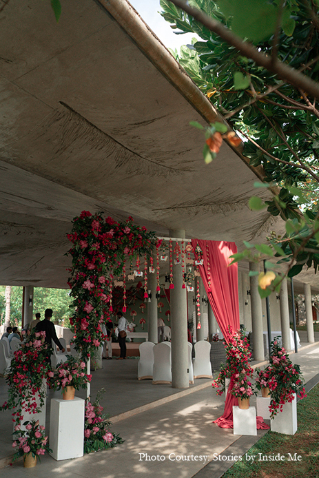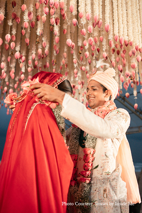 For the myra, traditional decor took center stage with the venue swathed in hues of red and orange. Red dreamcatchers with lotus motifs hung from wooden canopies with pichwai illustrations while red blooms adorned the other corners of the venue.