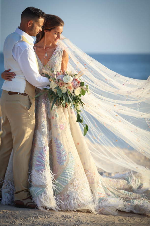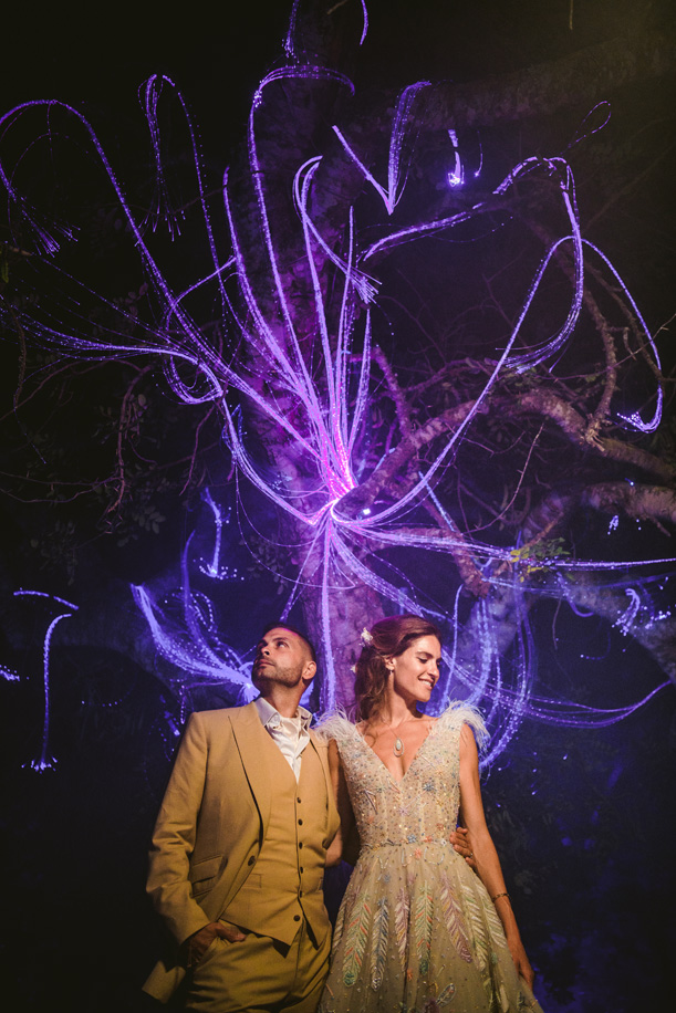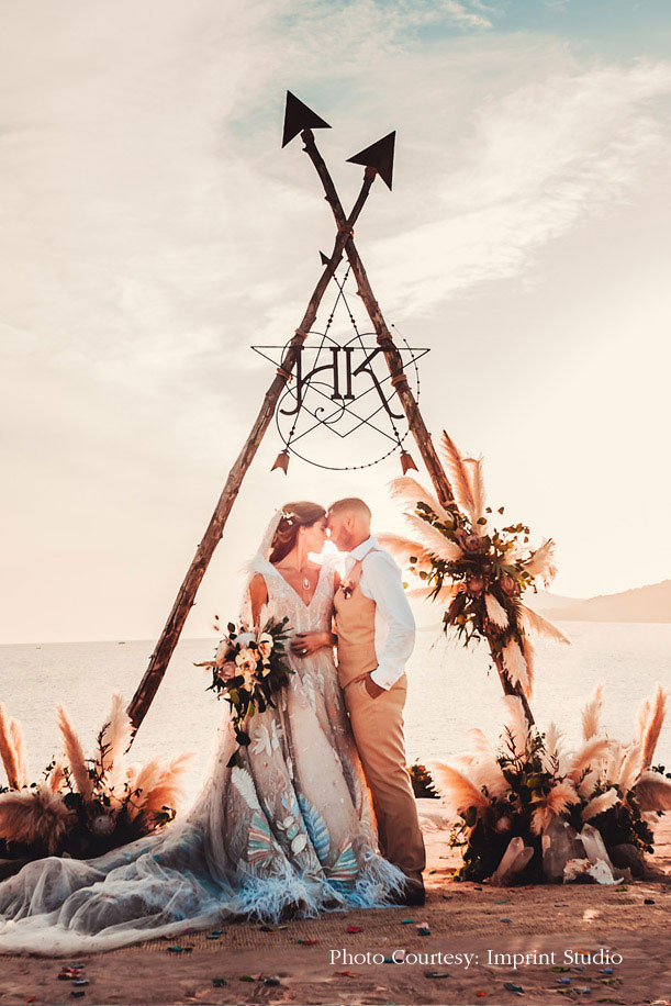 “‘Stars aligning for an adventure of a lifetime’ was the theme of our wedding. The decor focused on a mix of old-world explorer style decor with celestial touches, that reflected our journey as a couple. We had cues hinting to the place where we first kissed, our engagement in Thailand and the places where we lived and traveled to. We had the ceremony on the beach to represent when we first kissed and got engaged; the cuisines were from the countries and regions we visited during our relationship. We also invited friends and family to learn about their stars with astrologers and tarot card readers before luring our guests into the ‘jungle’ (a redecorated barn) for raving away into the early hours of the evening.”