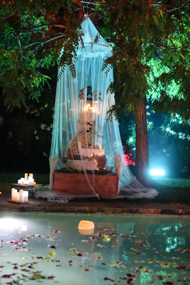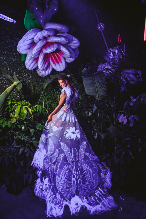 “Our reception wasn’t traditional at all; instead it was like a luxurious music, arts and cultural festival where each food stall was decorated according to their corresponding countries and regions. A lot of performers and artists made the evening more interactive. We had a face paint corner, a glitter stand, a flamenco corner, some belly dancers, and country fair games. The lighting set the perfect mood and helped spice up the guests’ palette and imagination! The main performances were from the British band, The Egg. They had also remixed a live version of our wedding song while an aerial performer hung and danced from a large earth balloon in the sky – it was incredible! Another noteworthy element from our wedding was our five-tier weddings cake with the constellations of our respective signs in LED lights on the top tier.”