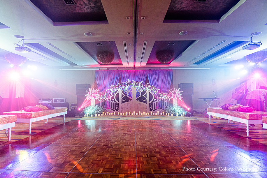 “We’d planned the sangeet on the lawns but the weather was unpredictable so we moved the celebrations indoors. The ambience was glamorous and romantic – a dark color palette dominated by black and purple with rose gold accents. Candles were part of the dance floor backdrop and the centerpieces and the low seating was covered in shimmery fabric.”