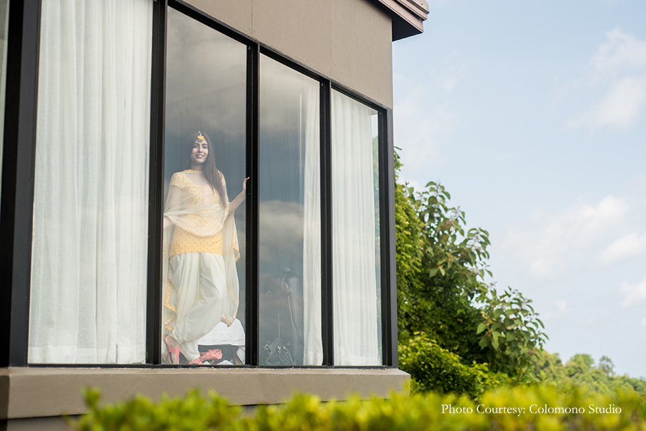 “We had a joint haldi ceremony with our immediate families in attendance on the amazing terrace of my hilltop suite. The room is at the highest elevation on the property and views of the entire resort and the ocean beyond form the backdrop.