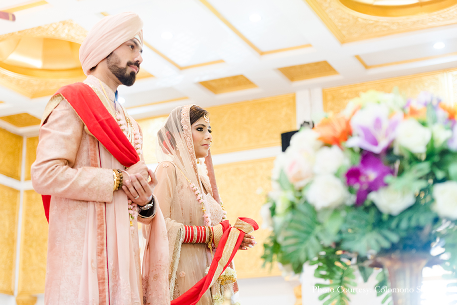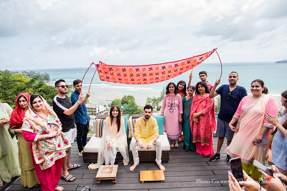 “The Sikh wedding ceremony was conducted at the Gurdwara Siri Guru Singh Sabha Phuket. We wanted to keep it traditional and minimal. Our clothes were all in hues of salmon. The men wore headcovers in the same color. My nephew came in with a sign that read ‘Here comes the bride’, which we’d ordered from Design Tuk Tuk Dubai.”