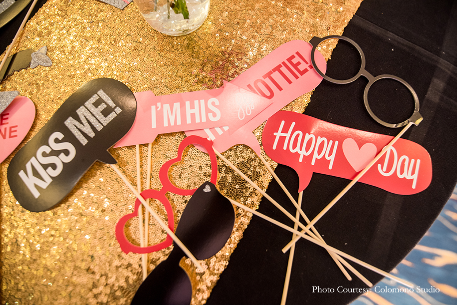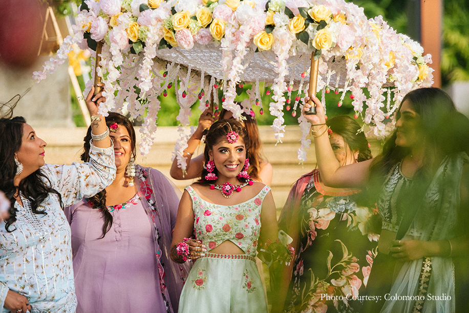 “The mehendi was hosted by the pool with a bright theme. In colors ranging from green and blue to pink and yellow, there were drapes, colorful signages, hanging umbrellas, and a backdrop made of tassels! We also had a cocktail list that included drinks named Lungi Island, Chennai Shaker, Patiala Sling and Balle Bombs inspired by our respective places of origin!”