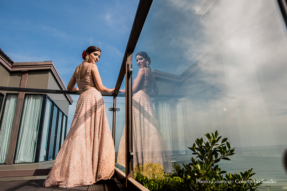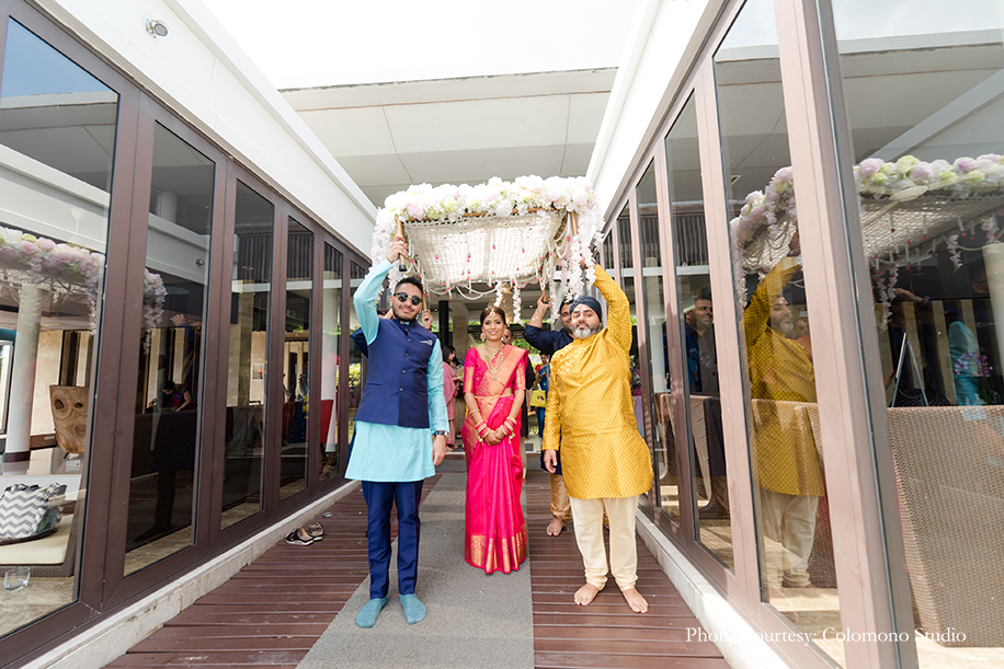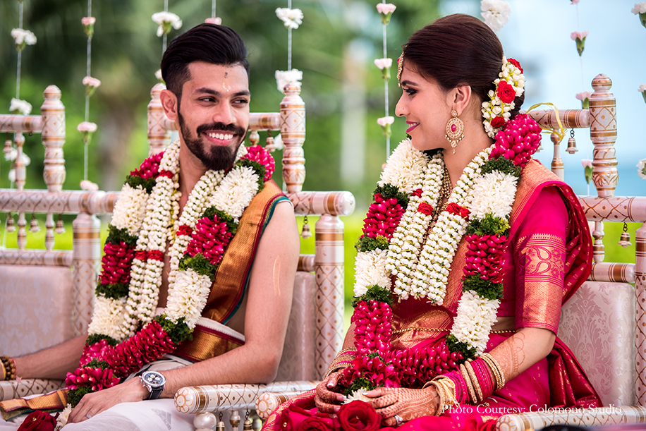 “As we’d imagined when we first came to the resort, our mandap was set up on the beautiful Kamala Lawn overlooking the beach. In tones of pink, peach and white, it complemented my bright pink Kanchipuram saree. Leading us to the canopy was an aisle covered in flowers.