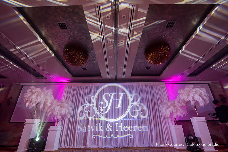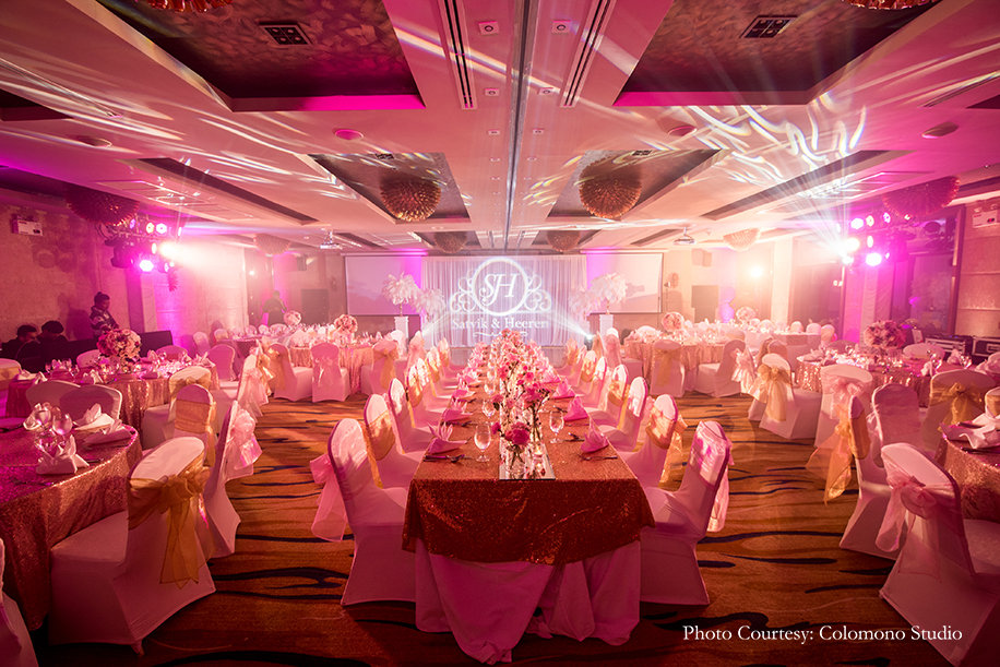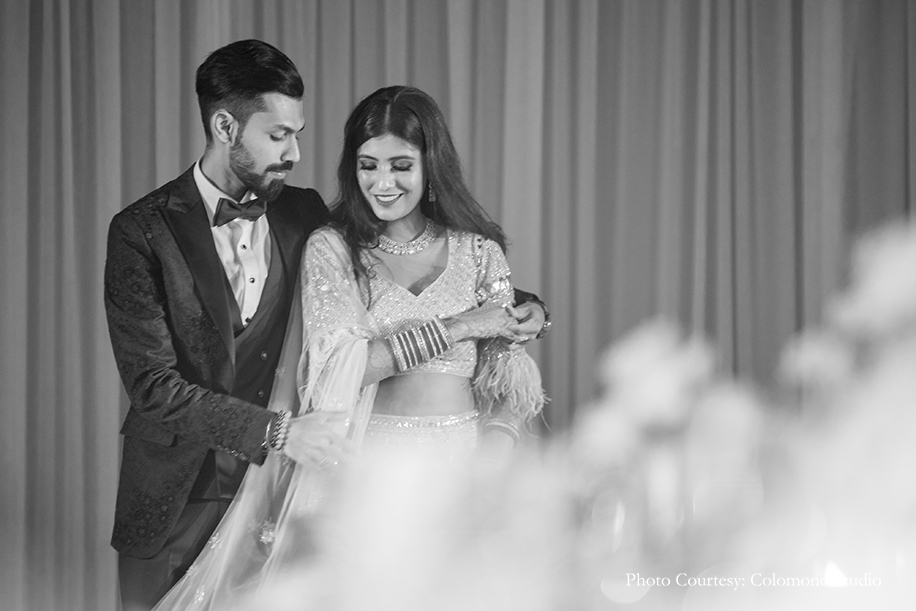 “White feathers dominated the décor set up at our reception and were part of the backdrop and the centerpieces. These touches of drama piqued the sophisticated decor with its white, peach and pink palette with hints of gold. The mix of long and round tables were decorated with floral and mirror elements. I wore a pink and silver lehenga with birds embroidered on the skirt and feathers on the sleeve and dupatta, an outfit chosen keeping in mind the theme. You have to know that my husband is a very good singer (goodness knows that’s how I fell in love with him in the first place) and his YouTube channel has garnered over 3 million views for his song covers! So of course there had to be singing! We recorded a cover of the song ‘Zara Zara’ from Rehna Hai Tere Dil Mein. He sang the original Tamil version and I sang the Hindi parts. We recorded it, produced the music and performed to it!”