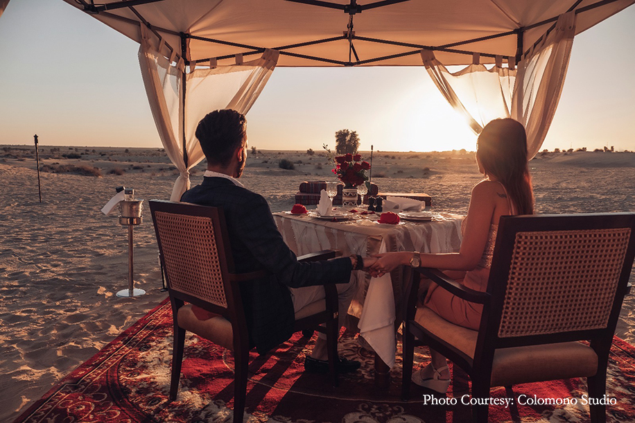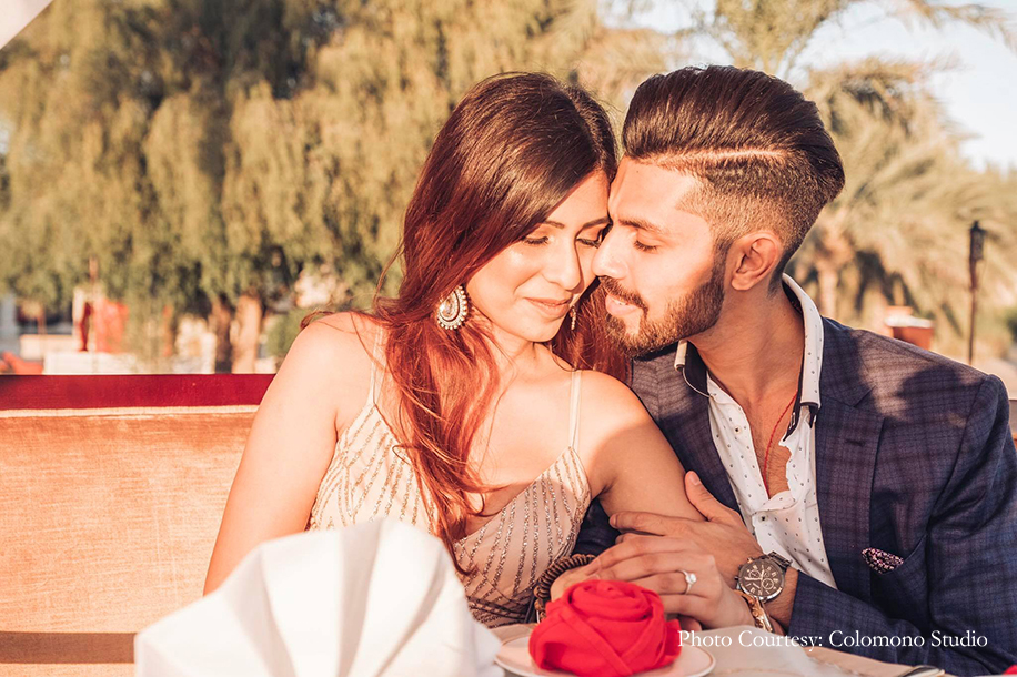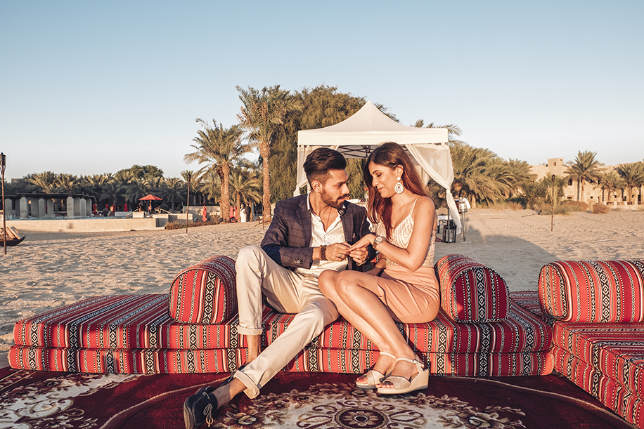 We came to the last post which said, ‘Our lives are about to change’. Then we were escorted to a beautiful set up in the desert. The sun was setting in the backdrop, and he got down on one knee and proposed! We both got so emotional immersed in the moment. We wrapped up the night with an amazing dinner in a private cabana with our own butler, cocktails, shisha and a secluded bonfire set up.”