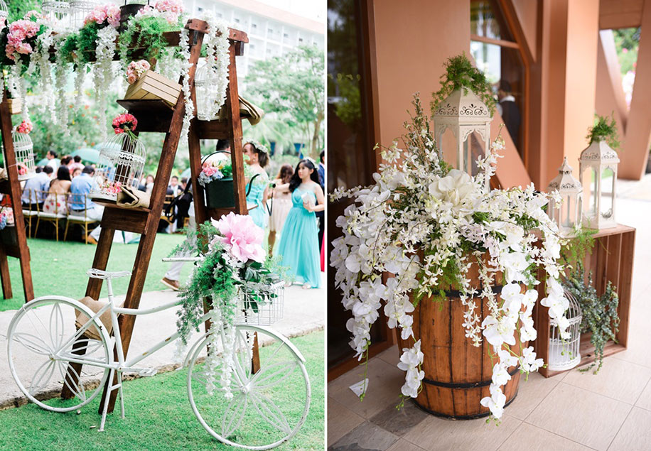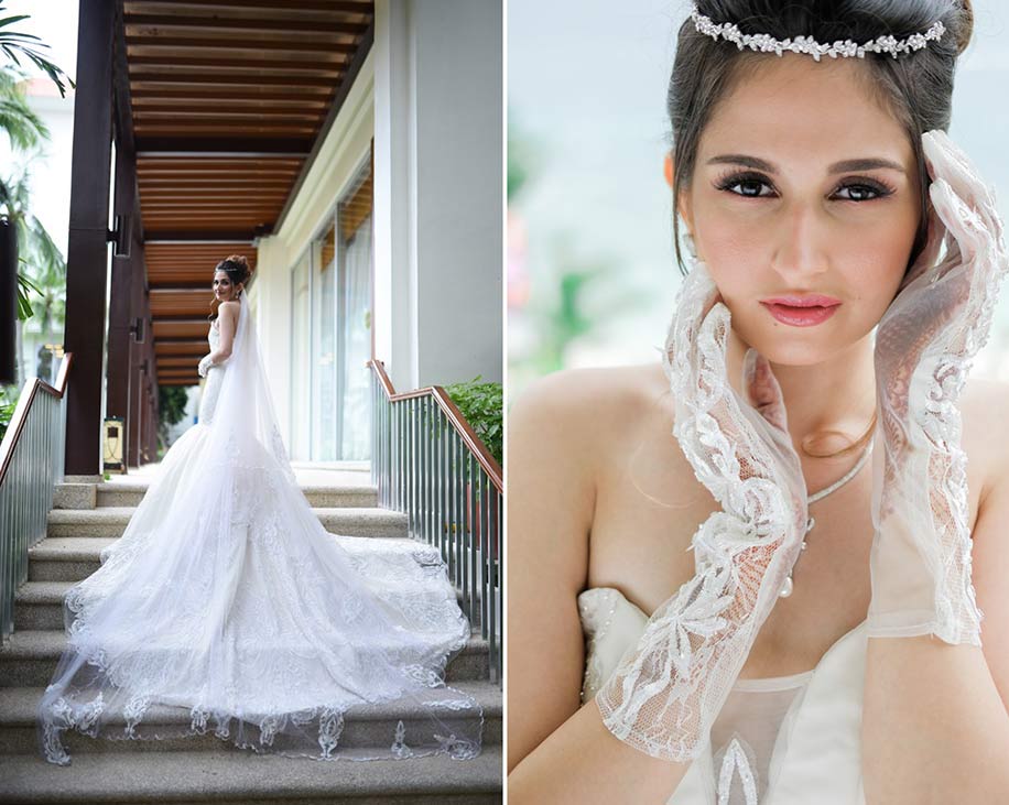 “We had a beautiful wedding ceremony at the Ocean Pavillon of the hotel. This was at a beautiful chapel-like hall which overlooked the ocean. We kept the decor quite rustic which beautifully contrasted with the fairytale theme of the ceremony. I was welcomed with much fanfare as I made my entry in a decorated golf cart which definitely made my bridal entry quite memorable. From unlimited cocktails to scrumptious food, the party was enjoyed by all our guests. For the Christian wedding ceremony, I wore a stunning fishnet gown with a long trail that made me look like a fairytale princess.”