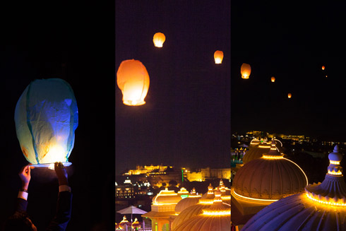 The festivities commenced with an evening Tikka ceremony at the Trident. It was a small family function that became a much larger event as many guests had flown in a day earlier. The Mehndi and sangeet function was held next day at Chunda Palace on the terrace of the lower floor and the adjacent billiards room so guests could relax indoors at intervals. In keeping with the authentic Rajasthani theme, there were puppeteers, potters, bangle makers and dancers for entertainment, and local street food was served with fun cocktails. The Sangeet was held at the rooftop of Chunda Palace that evening. Dhols, fire blowers, Rajasthani dancers and a deejay brought alive the magic. The best entertainment of the evening though, was the friends and family dance performance. At the end of the night, each guest released a wish lantern into the night sky.