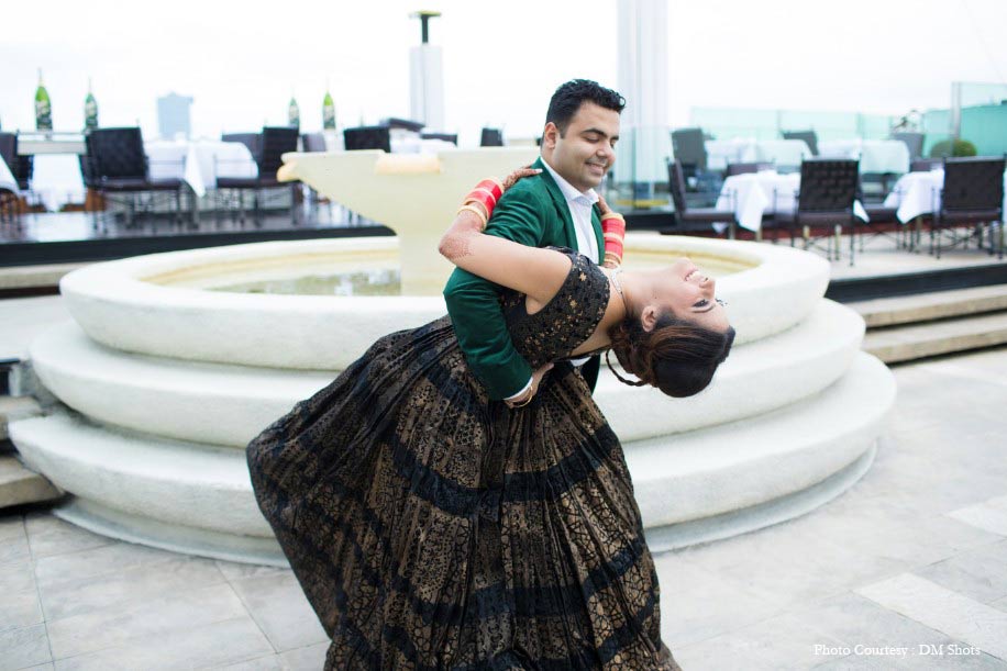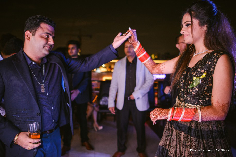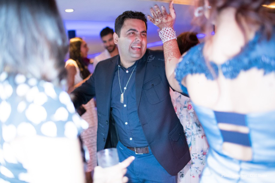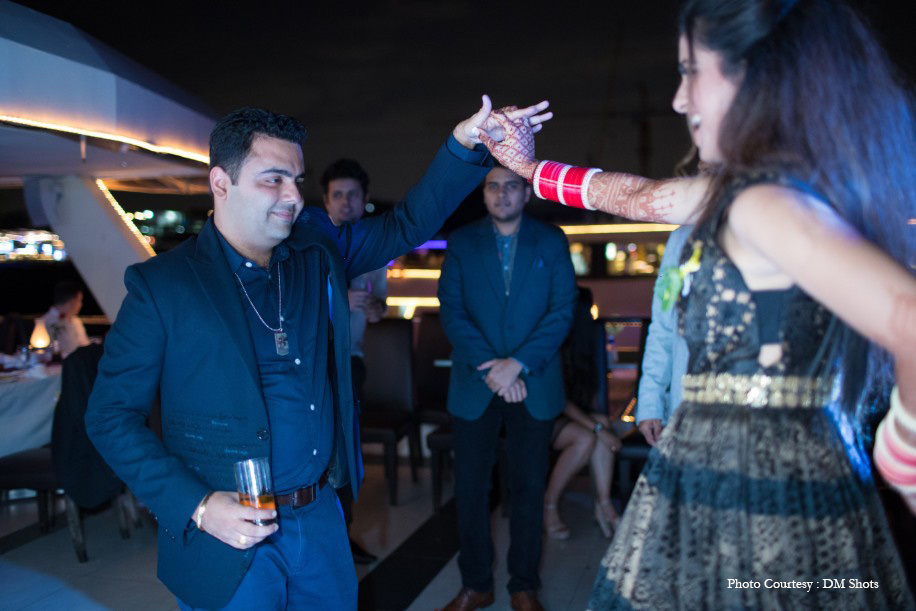 “For us, a cruise reception was our choice and was the highlight of the wedding as it served as an amazing venue. The party later shifted to the bridal suite of the hotel and this night made for a fitting end to our wedding. A black Shantanu & Nikhil gown was Jazz’s outfit of choice for this function while I opted for a green jacket and paired it with blue trousers.”