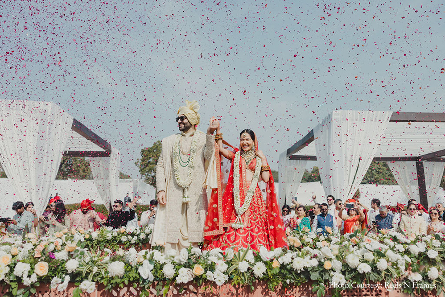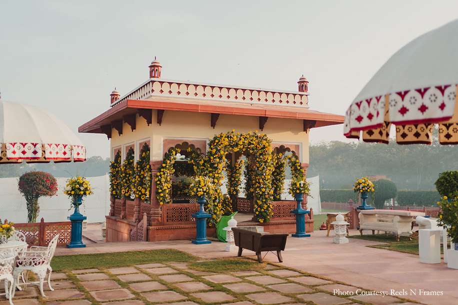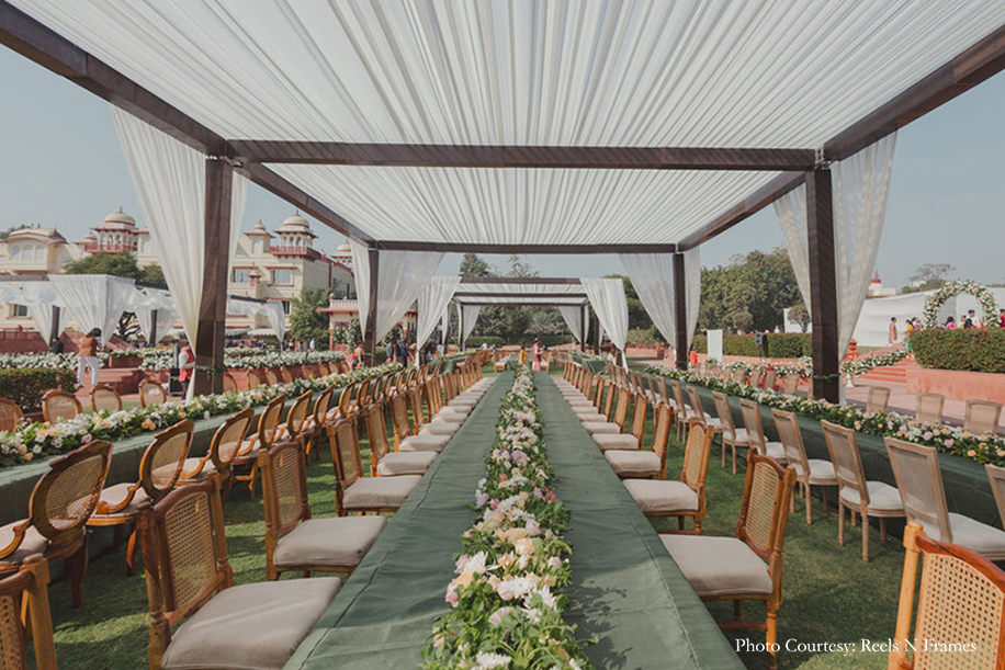Keeping elegance and style at the forefront of the design story, The Doli Diary ensured that this union reflected Kahini and Aditya’s individual styles. Inspired by the region’s intricate art forms, natural beauty and majestic architecture, as planners, they infused every event with Rajasthani vibrance. The wedding was hosted at the majestic Jai Mahal Palace in Jaipur which amplified the beauty of the celebrations with its heritage architecture and landscaped gardens.