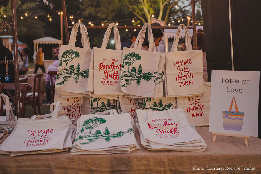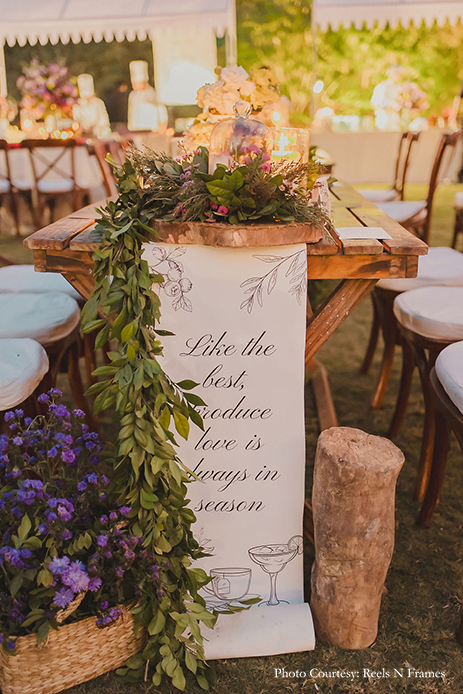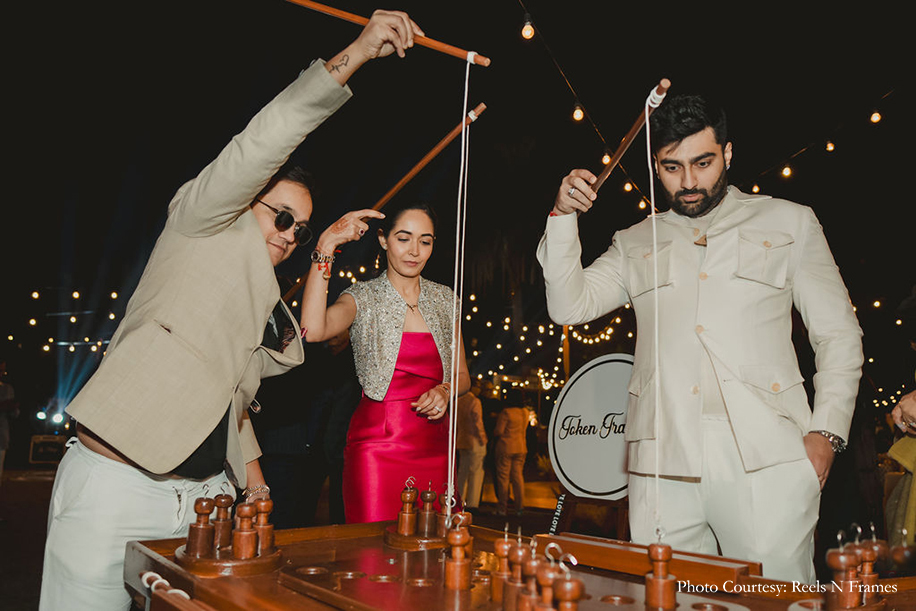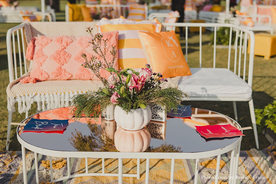 Neha Wadhawan and Jinal Patel from The Doli Diary share, “The polo match with its sunkissed fuschia and yellow hues transitioned into a charming European-themed market sundowner. We had so much fun curating the games, and gifting stalls and live music for this event. Everyone followed the theme and dressed to impress with their hats and jackets. The decor for the meticulously curated European farmers market was inspired by Kahini and Aditya’s travel memories like the Christmas gift box photo booth, the bar name and a spread of their favourite foods.”