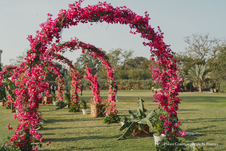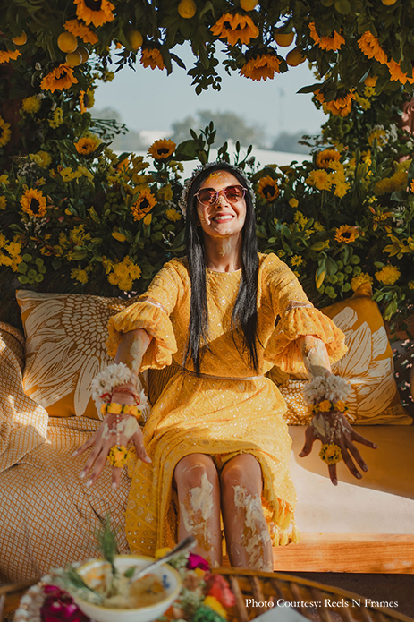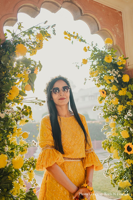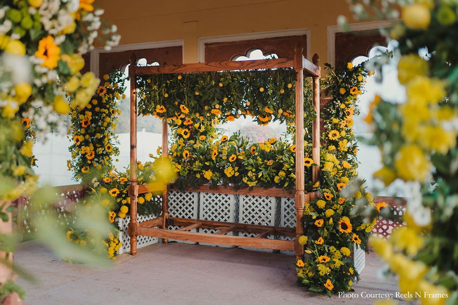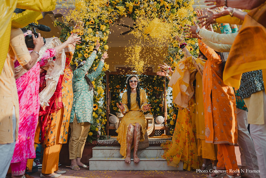 The wedding festivities commenced with haldi celebrations hosted separately for the bride and the groom’s side. The bride’s haldi flaunted Rajasthani and Italian vibes with sunflowers and blue pottery. On the other hand, groom Aditya’s haldi exuded vibrancy inspired by the hues of Punjab.