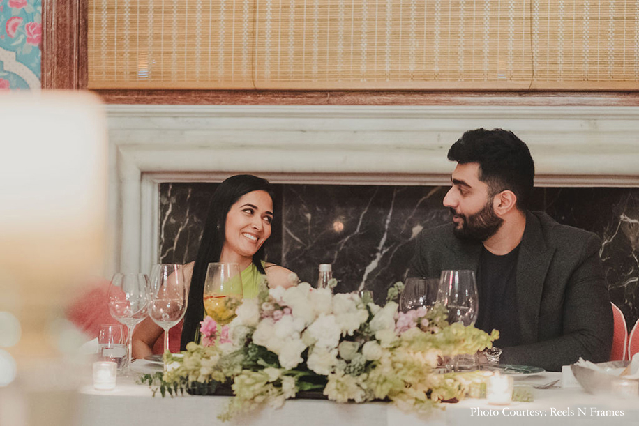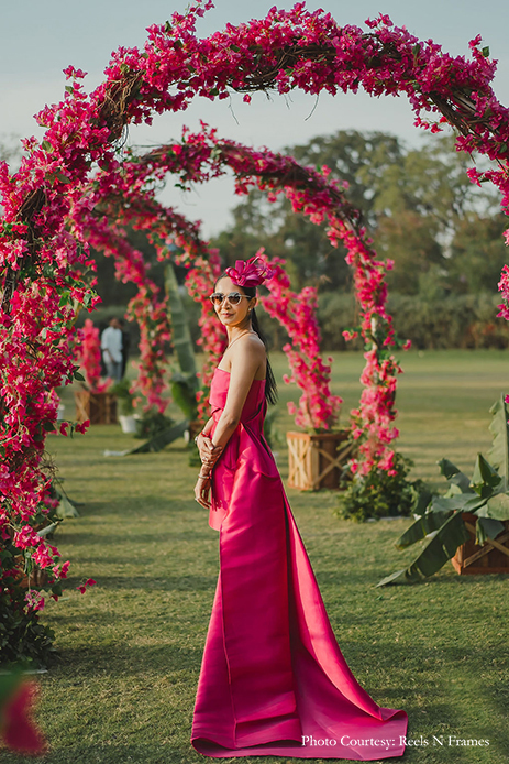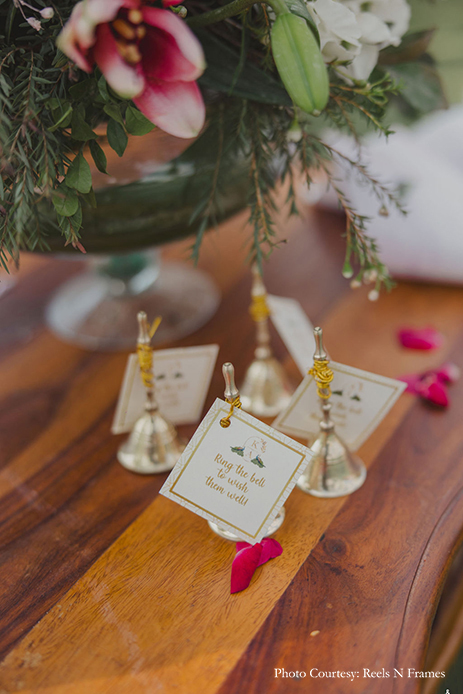 White drapes, minimal elements, tons of flowers and a sit-down lunch were the top highlights of the wedding which had approximately 250 guests in attendance. Neha and Jinal share, “We focused on leveraging the property’s landscape to build an overall minimal, elegant and chic vibe that reflected the couple’s personalities. The carefully curated seating chart by Kahini added a royal touch to their lovely sit-down lunch post the wedding. On a fun note, Kahini decided to walk down on ‘Bole Chudiyan’ for her varmala entry! The groom was delighted and surprised by his bride’s energetic performance.”