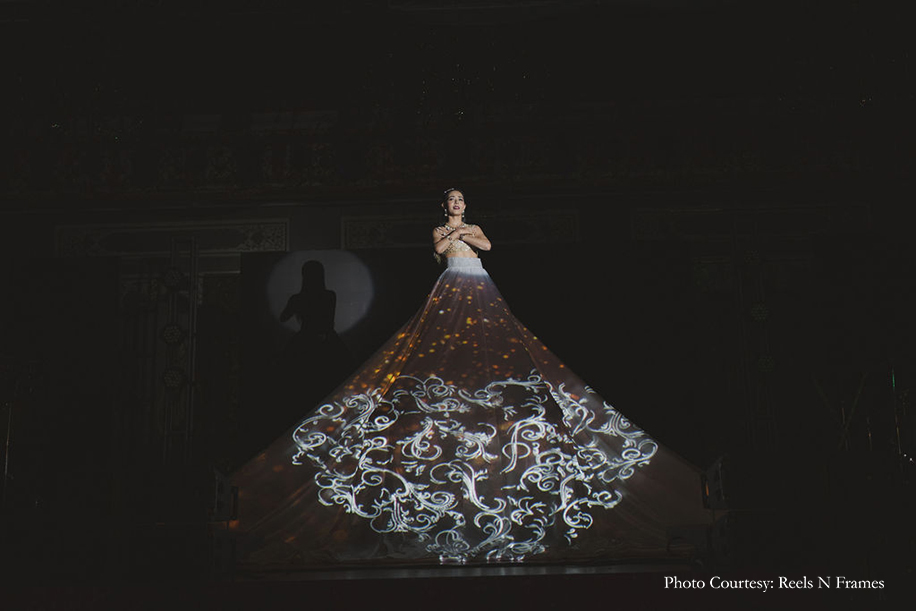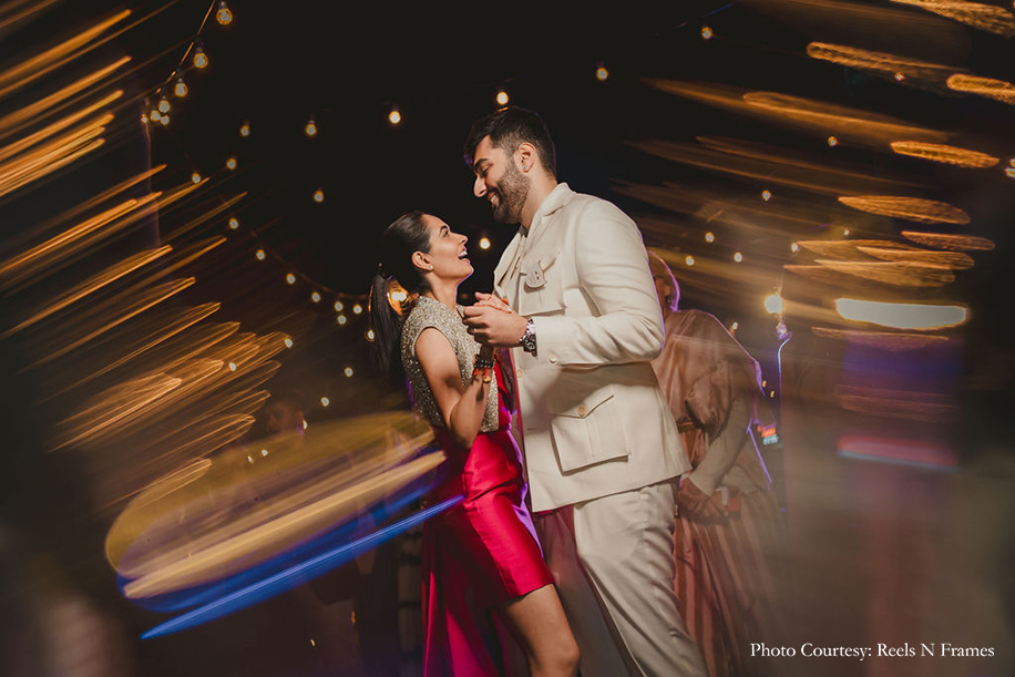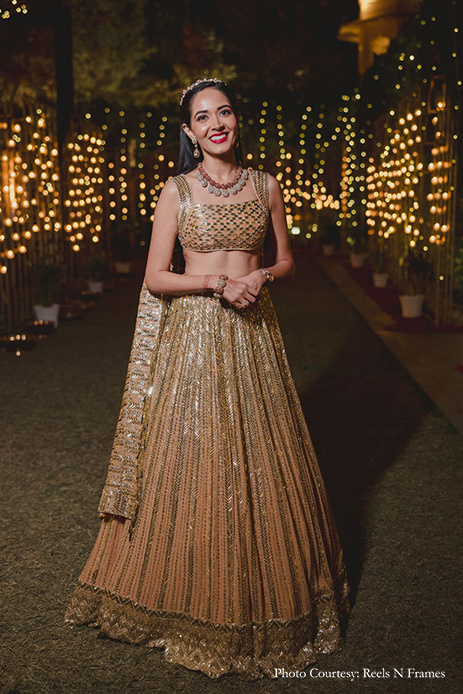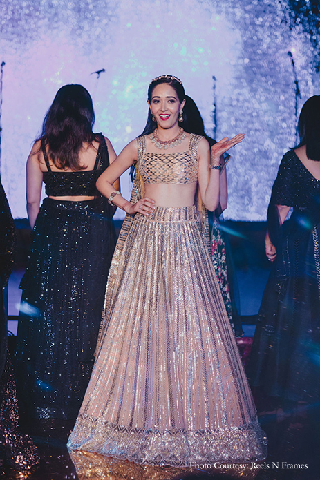 A combination of lit candles and red roses was used for the sangeet night to enhance the overall look and feel of the venue. It was a back-to-back mash-up for some of the iconic Sangeet songs of all time making it a night to remember for all. Red blooms, lush foliage and gold fairylights gave the event a cosy vibe. The bride, with her holographic skirt act, had everyone mesmerised!