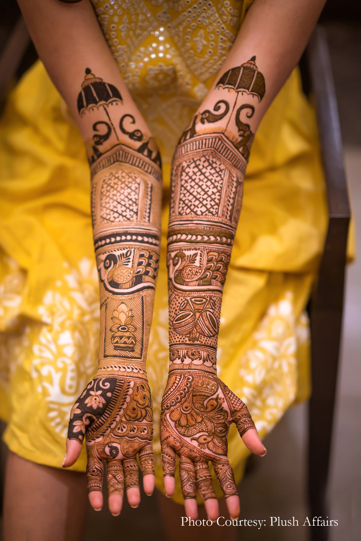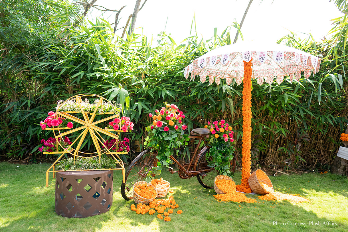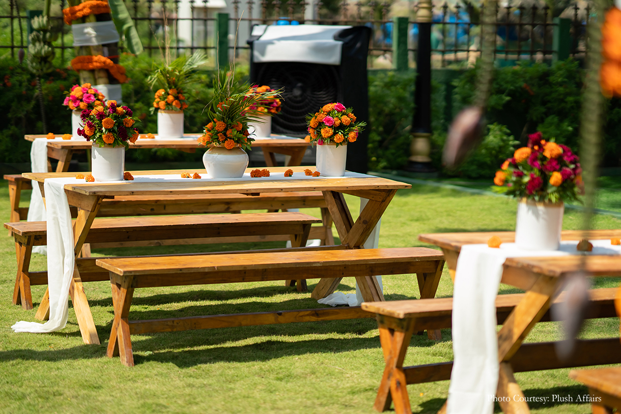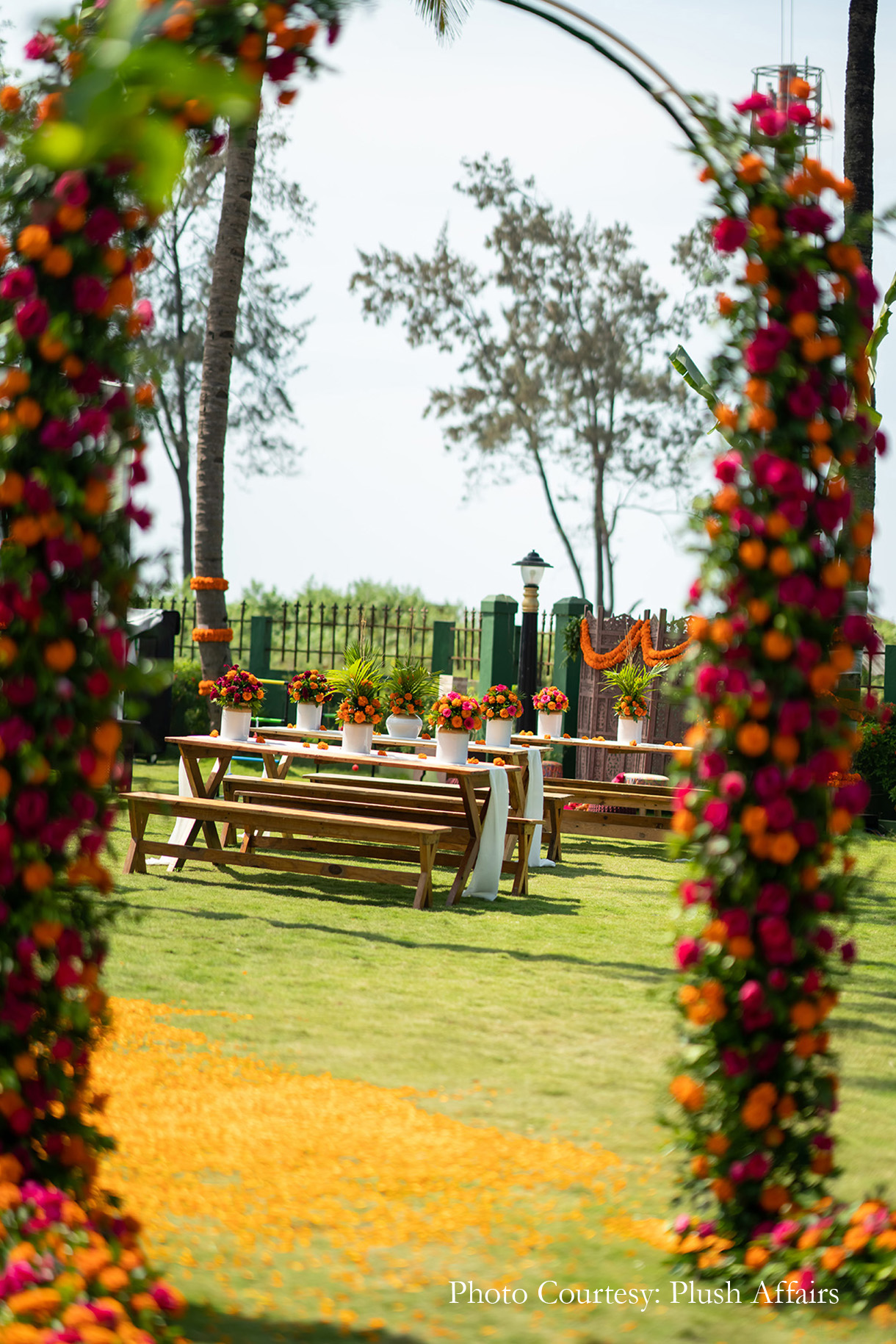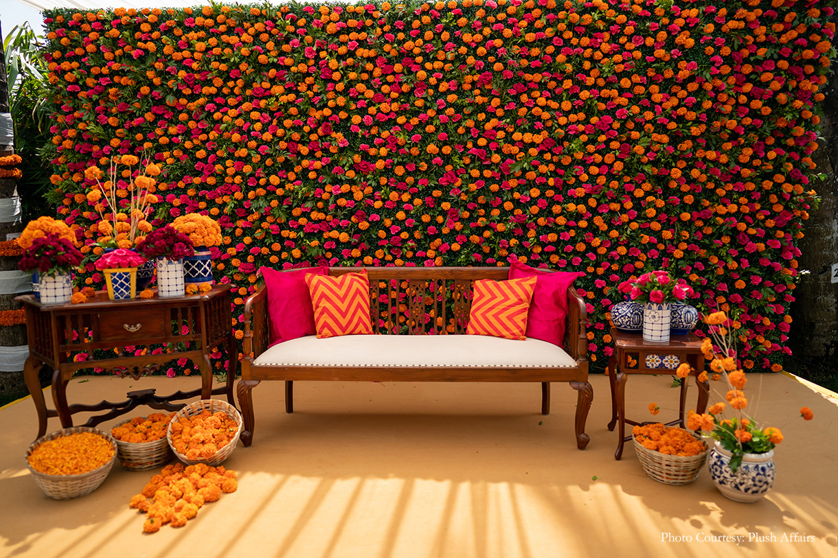 Zashank shares, “The couple started their wedding festivities with a vibrant mehendi luncheon. Simple and intimate, they danced and enjoyed themselves with their close family and friends. The décor was abundant with marigold and dark pink roses combined with antique wooden furniture, a stunning bridal seat, a wooden partition photo-op and ceramic props.”