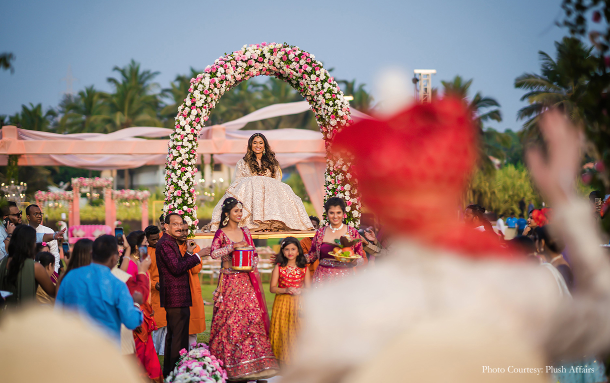 Shashank shares, “Next in the line was the sangeet ceremony, for which the couple had selected an evening by the beach. The beauty of the location was enhanced with a lot of rice lights and a little touch of florals. The marble walkway was beautifully converted into a performance stage with stand lights and a flower bed. The sangeet had everyone twirl on the mix of Bollywood, Marathi and Goan tracks.”
