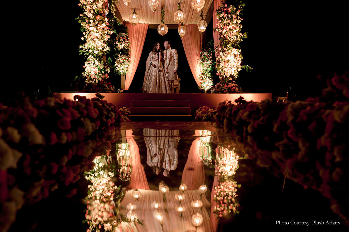 Zashank recollects, “ For their last event, the couple chose a blush colour palette. The couple exchanged varmalas crafted out of lotus blooms. The chrome-plated aisle was embellished with blooms and they entered to the tinkling of brass bells that were being rung by their loved ones. The evening included cake cutting, speeches by the family and a soothing performance by tabla and flute artist. Gazebos ensured everyone got a comfortable place to relax while photo-op spots resulted in a frenzy of selfies.”