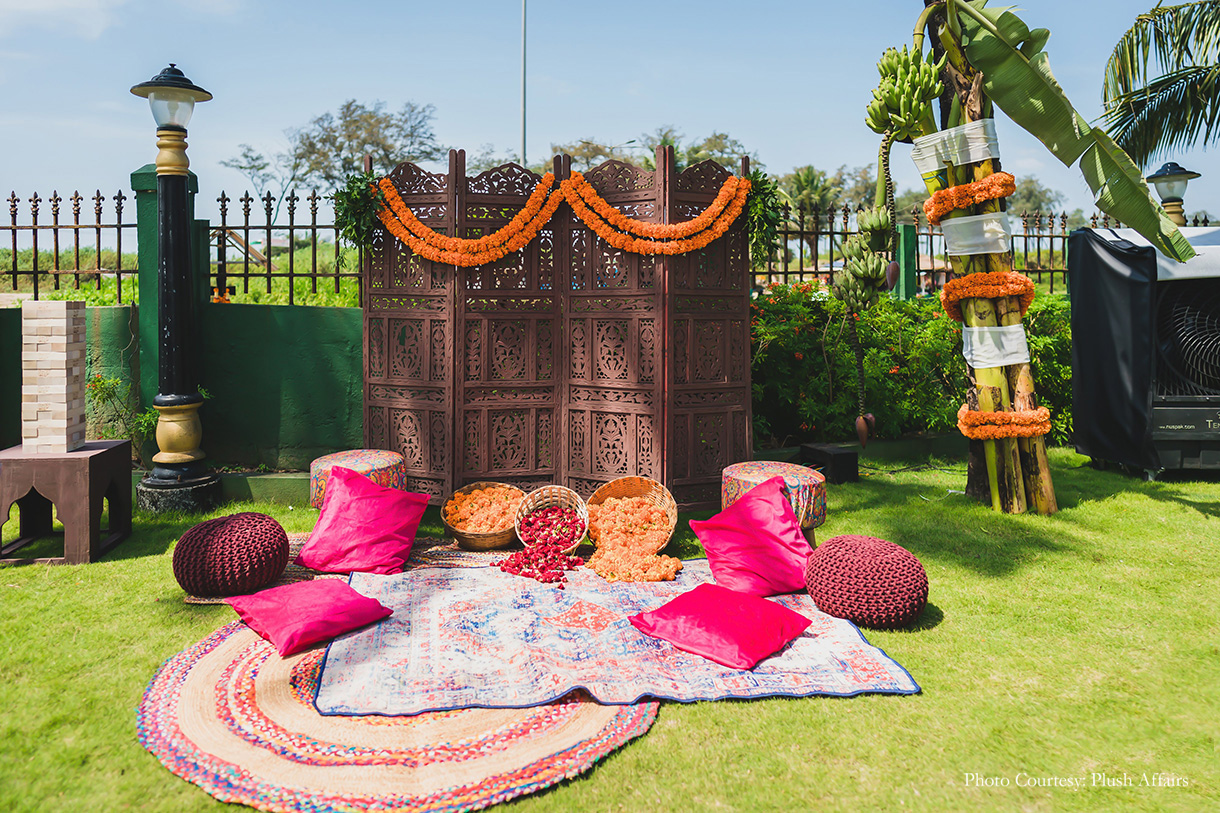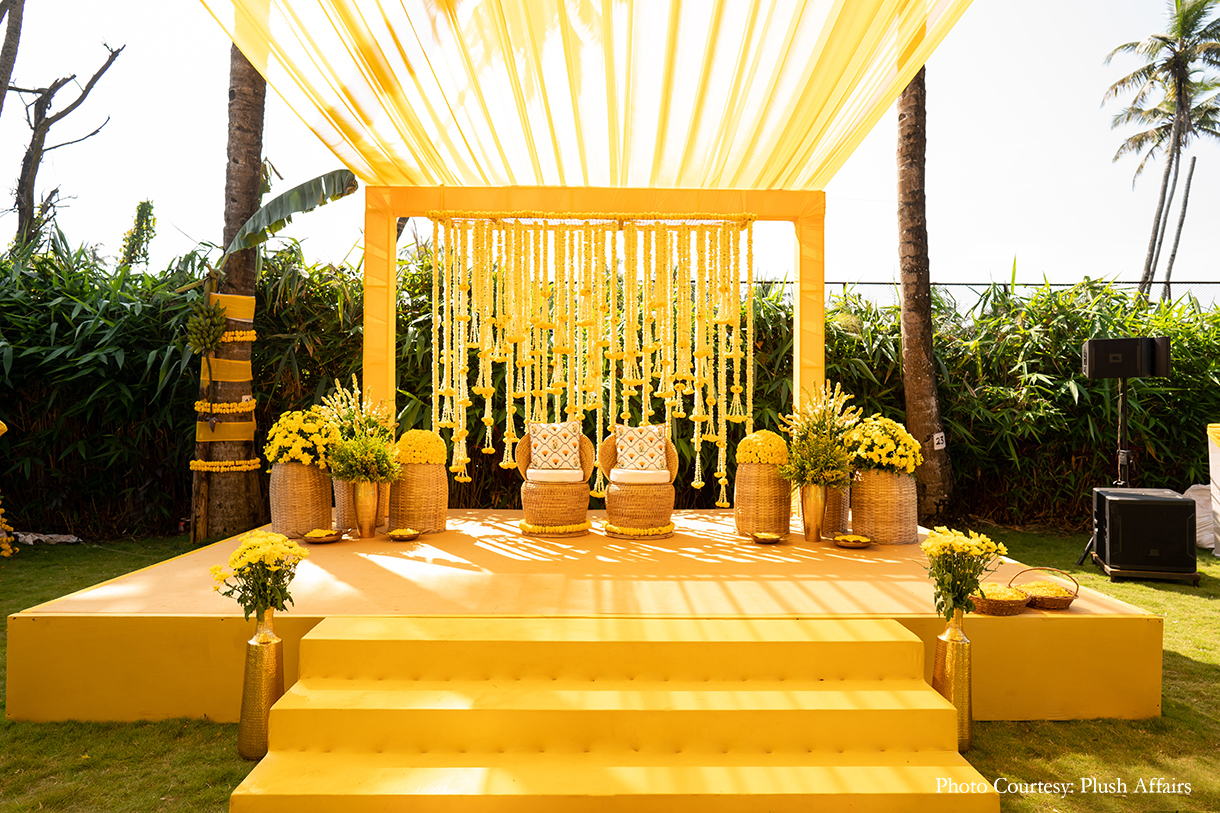 Zashank shares, “The Haldi ceremony was an intimate one. A blend of different white and yellow flowers the décor looked absolutely delightful with cane and wood furniture.