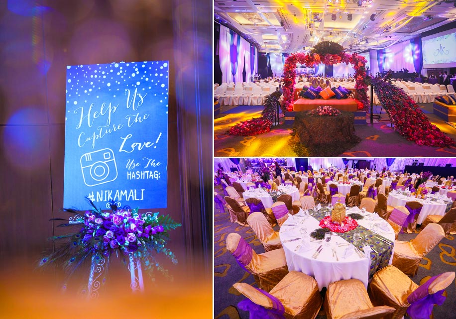 The sangeet ceremony had a rich Indian vibe with a peacock theme. The dress code was ‘Imperial Indian’ and guests came dressed in beautiful regalia. Popular singer Mika entertained the crowd with his foot-tapping numbers. Kamali and Nikhil beautifully coordinated their outfits – she wore a bespoke deep blue anarkali by Manish Malhotra, while Nikhil chose a blue sherwani with gold threadwork by Manav Gangwani. The décor for the event included a stunning giant peacock installation at the entrance and pretty peackock feathers and candle jars as accents atop dining tables. There were also high arches with peacock feather motifs which were studded at the base with matching purple and blue blooms.