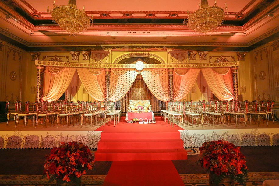 The wedding had a British Raj theme and was given the name ‘Palatial Promise’. The dress code for this do was ‘Elegant Indian’ – and Kamali looked every inch a classy princess in her custom-made ornate ‘Hyderabadi’ lehenga by Sabyasachi. The gorgeous ‘booti’ work on her short-sleeved blouse paired well with the red and green ensemble which had silver and gold threadwork. Nikhil’s sherwani by Sabyasachi was a white sherwani with intricate threadwork and a maroon stole which grabbed as much attention as did his regal red ‘safa’. The mandap had beautiful garlands of red roses strung from the ceilings.