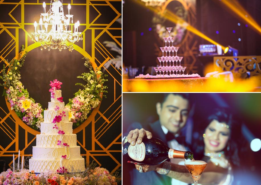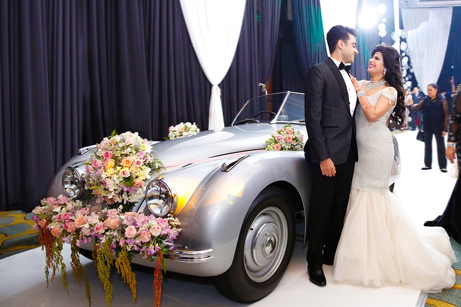 Kamali and Nikhil made a grand entry to their reception in a polished grey vintage convertible adorned with floral bouquets as guests in the ‘Black Tie Formal’ dress code whipped out their smartphones to capture the moment. A stunning pearl-white seven-tier cake was one of the highlights of the reception which saw popular singer Kanika Kapoor serenade the gathering with her peppy numbers. Kamali again opted for a custom-made pearl-white gown with beaded short sleeves by Manav Gangwani which she paired with delicate jewellery. Nikhil donned a sharply tailored tuxedo from House of Launganis.