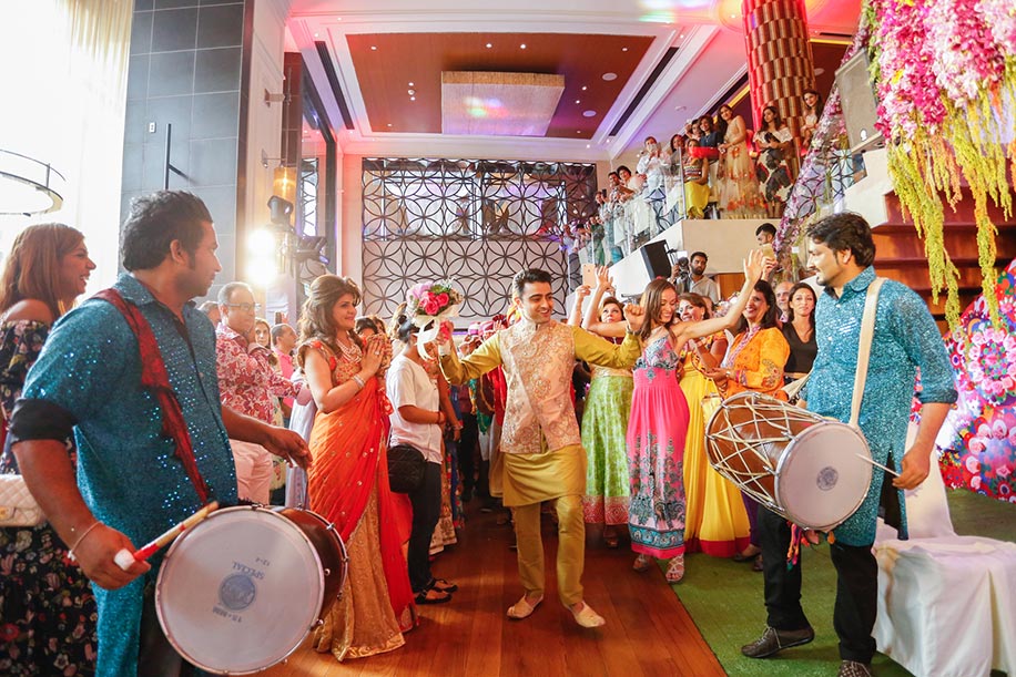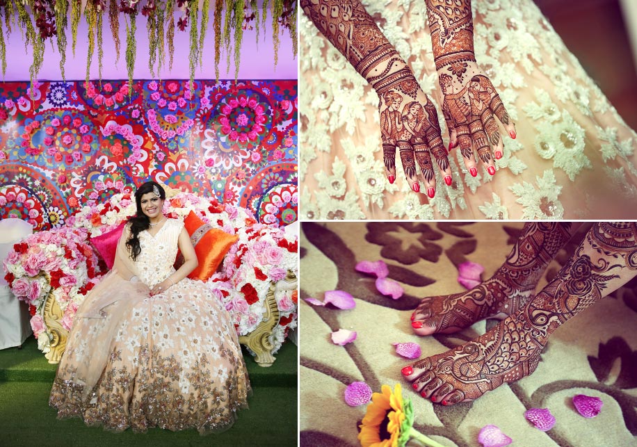 For the mehndi ceremony, the décor followed a ‘Petals & Paisley’ theme, while the dress code was ‘Floral Fantasy’. A beaming Kamali donned an ornate salmon pink gown with white sequin flowers all over the skirt which was designed by India’s designer to the stars – Manish Malhotra. The couple sat on an impressive ‘floral sofa’ embedded with blooms against a bright multi-patterned backdrop.