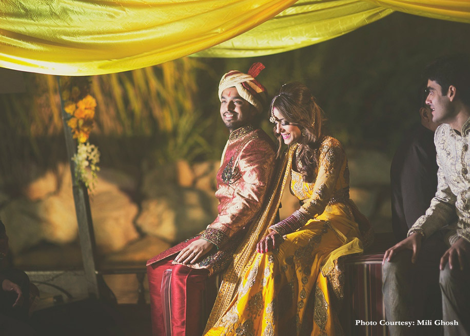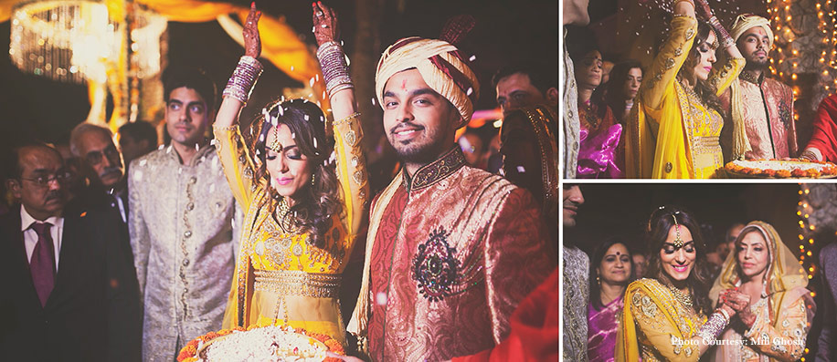 “Our wedding venue was decorated in yellow and white. Satpreet’s ‘baraat’ (groom’s procession) started from Al Qasr, another standout hotel at Madinat Jumeirah, while I arrived in an ‘abra’ (traditional Arabic boat) along the canal that winds through the resort. When I got off the abra, a thousand balloons were released to signal my arrival. It was magical and I felt like a princess. Satpreet wore a bronze sherwani for the wedding ceremony which paired well with my yellow ensemble.”