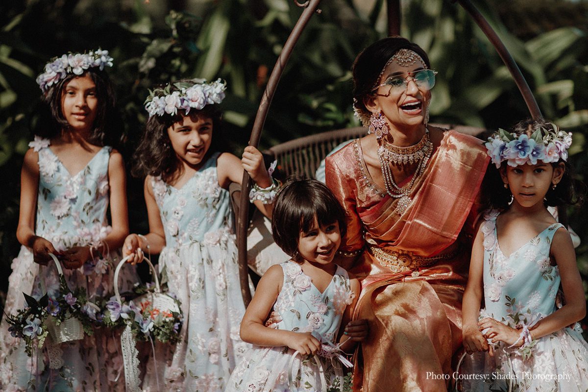 Kavita shares, “This was the one event where we both wanted to keep things very traditional. I always wanted to look like a traditional Telugu bride for my ceremony, and my mom helped curate the perfect outfit. My friend Vidya gifted me stunning shoes from Papa Don’t Preach by Shubhika to finish off the outfit. My nieces were the cutest flower girls and all of our friends came together to form a massive bridal party in matching sarees and kurtas. We wanted everyone to feel as if they were a part of our tribe, especially when we had people travel so far.”