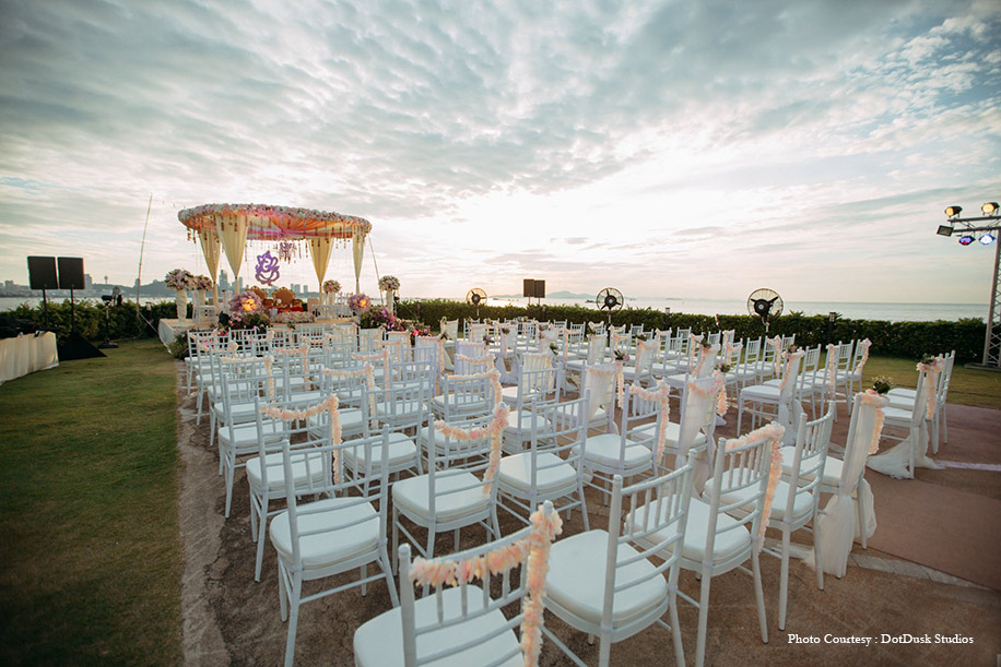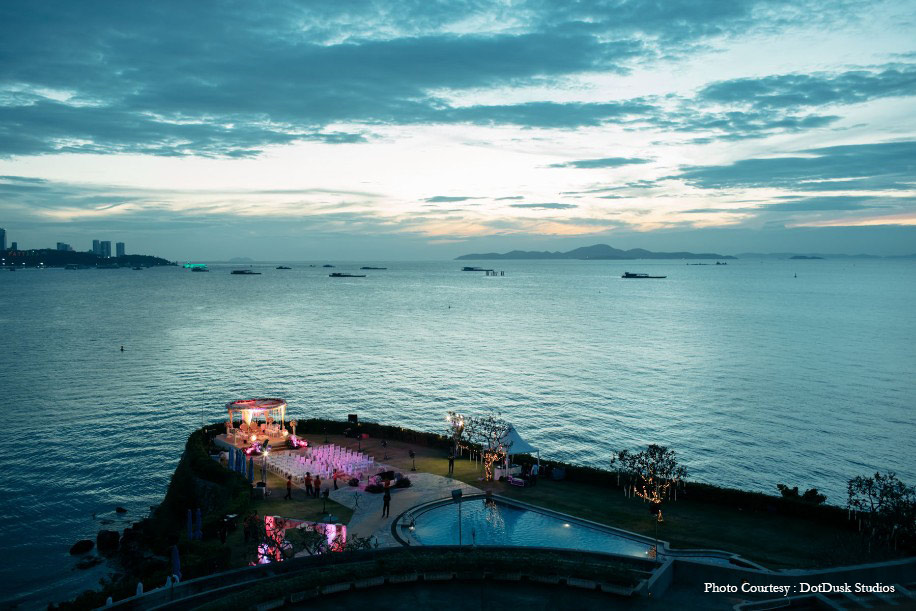 “After looking around at a couple of resorts in Bangkok, Phuket, and Pattaya, we knew we wanted a place which is close to Bangkok as the travel time from Dubai to Bangkok is long, and with a place further away, the drive would get exhausting for our guests. Being just one hour away from Bangkok, Dusit Thani Pattaya made for the perfect location. It overlooks the sea and has a cliff which makes for a beautiful backdrop for a dreamy wedding. Wiracha is the Director of Events and Weddings there, and she was our biggest support throughout – right from planning to execution. She ensured everything was smooth for us. On the wedding days, she would make sure that she and her team were around us in case we needed anything. She was also one of the main reasons we booked this property. She always made our families and us feel comfortable and went out of the way to fulfill quite a few of our needs. The hotel has three huge ballrooms, and we used a different one each night.”