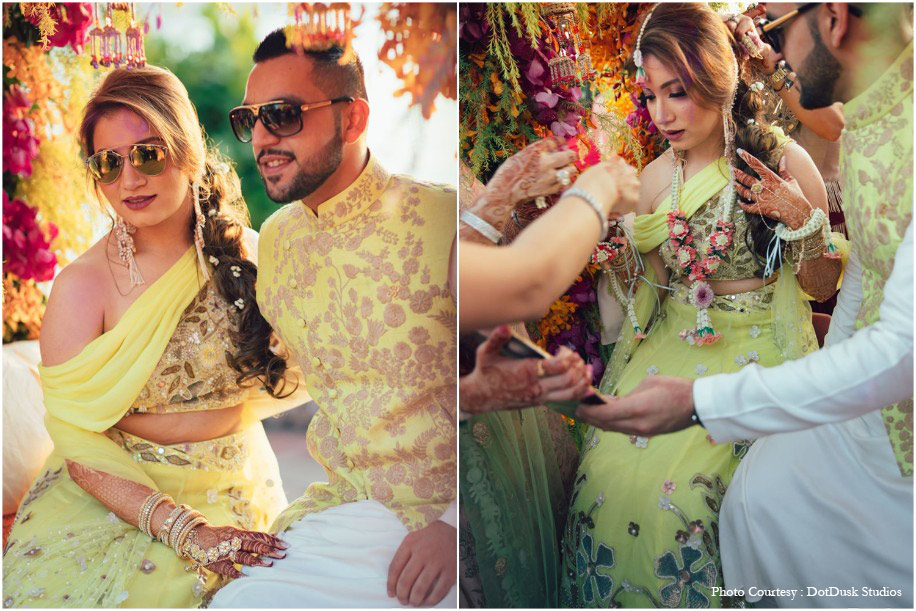 Yoshita Couture gave me a perfect lime yellow outfit with 3D flowers and tassels on my dupatta. Rahul wore a white side cowl kurta with a cross buttoned bandi jacket which matched my outfit.”