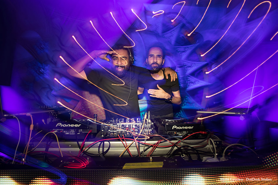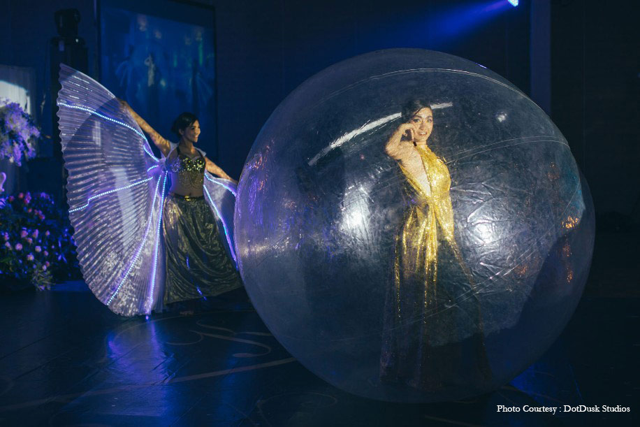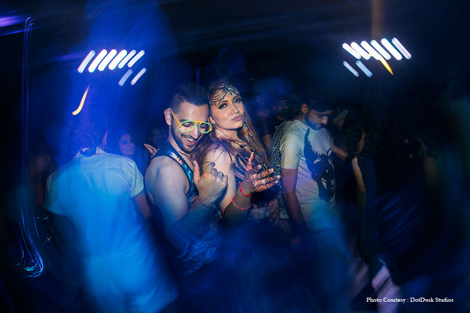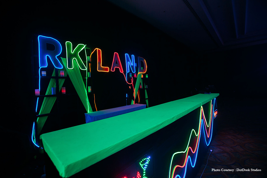 The youngsters left the ‘Sufi Night’ by 3:30 am to go to the rave party. It was our very own mini ‘Tomorrowland’ (electronic dance music festival) themed event. We had tried to plan a visit to Tomorrowland with our friends but something always came up, and we ended up not going, so we decided to come up with ‘RKLand’ and have a party of our own. Here we had the CO2 guns, girls in LED costumes, a sun-shaped backdrop on the stage, an LED screen in front of the DJ and an LED table.”