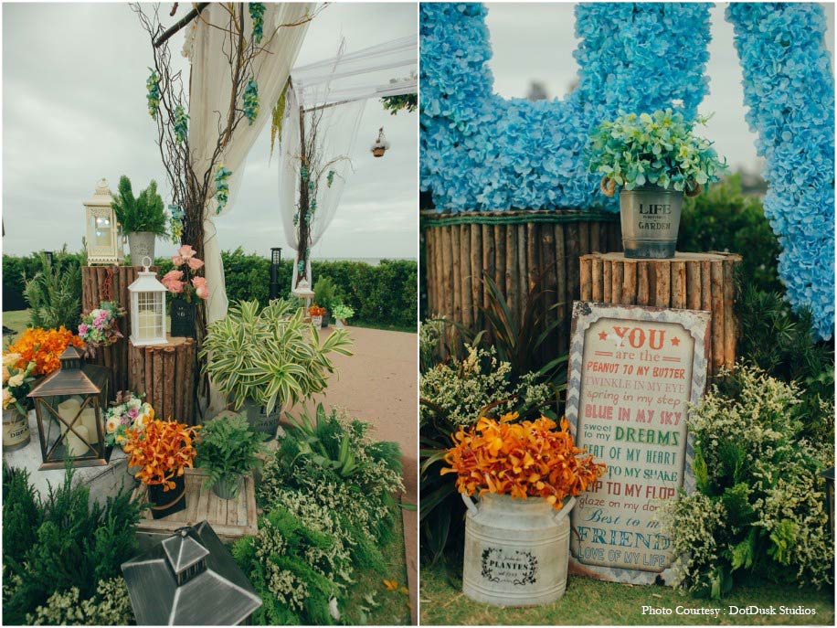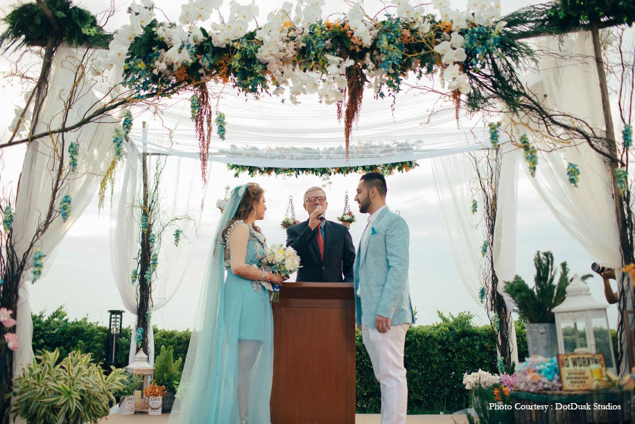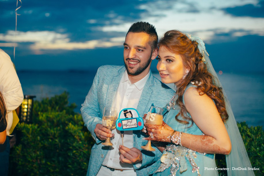 “I have grown up watching English movies, and I always loved the idea of exchanging vows. I walked down the aisle wearing a powder blue gown with my father by my side. The weather was perfect and the decor even better than I had imagined. I bought rustic wooden glasses for the two of us to drink champagne from, and they read ‘MR’ and ‘MRS.’ We released balloons at the ceremony. The most special part of this ceremony was the surprise that had been arranged for me. We had an artist who painted the scene of our vows live as it took place. It’s something I will cherish forever.”