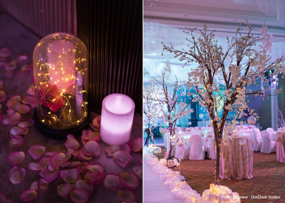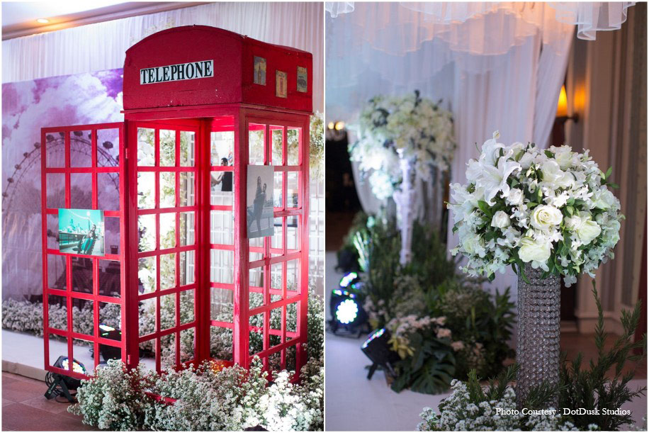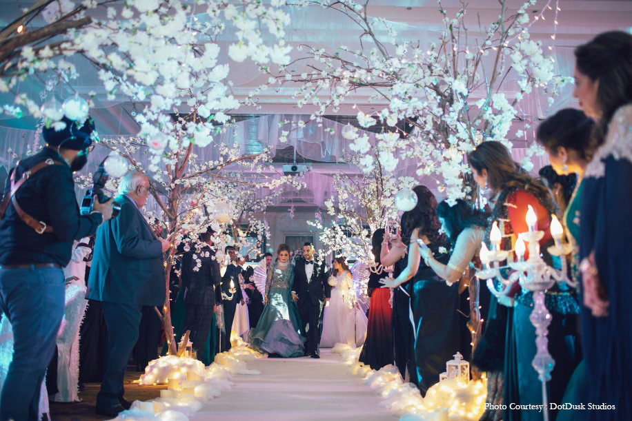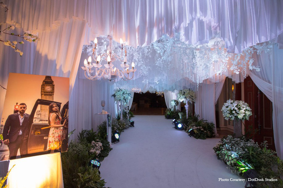 “Our love for London winters was the inspiration behind the decor for our reception. Rahul and I had a photoshoot there, and we felt that this was the best time to put those pictures up on display. We set up a red telephone booth and exhibited those photographs inside it. The room was made to look like a snowy day, and a white walkway fringed with candles and white trees ran through the center of the ballroom. ‘Cinderella’ has been my favorite fairytale since I was a little girl. Therefore, my Gaurav Gupta gown was chosen to keep the character’s style in mind. Taking it one step further, Rahul and I even entered the venue in a carriage that was evocative of Cinderella’s magic pumpkin carriage.”