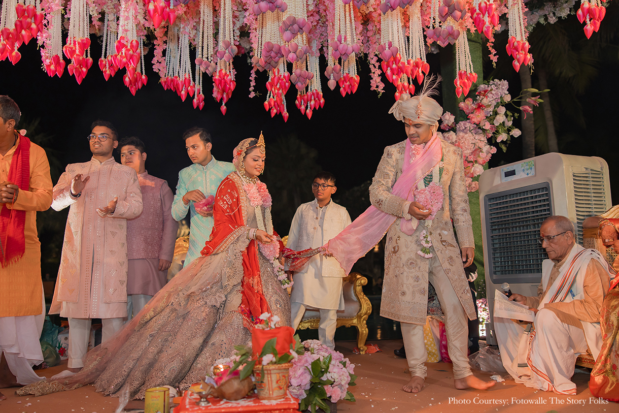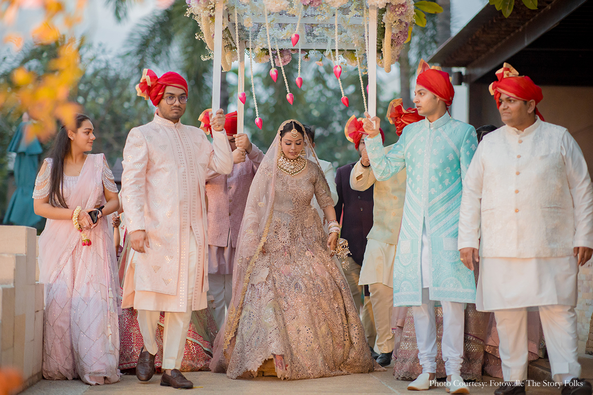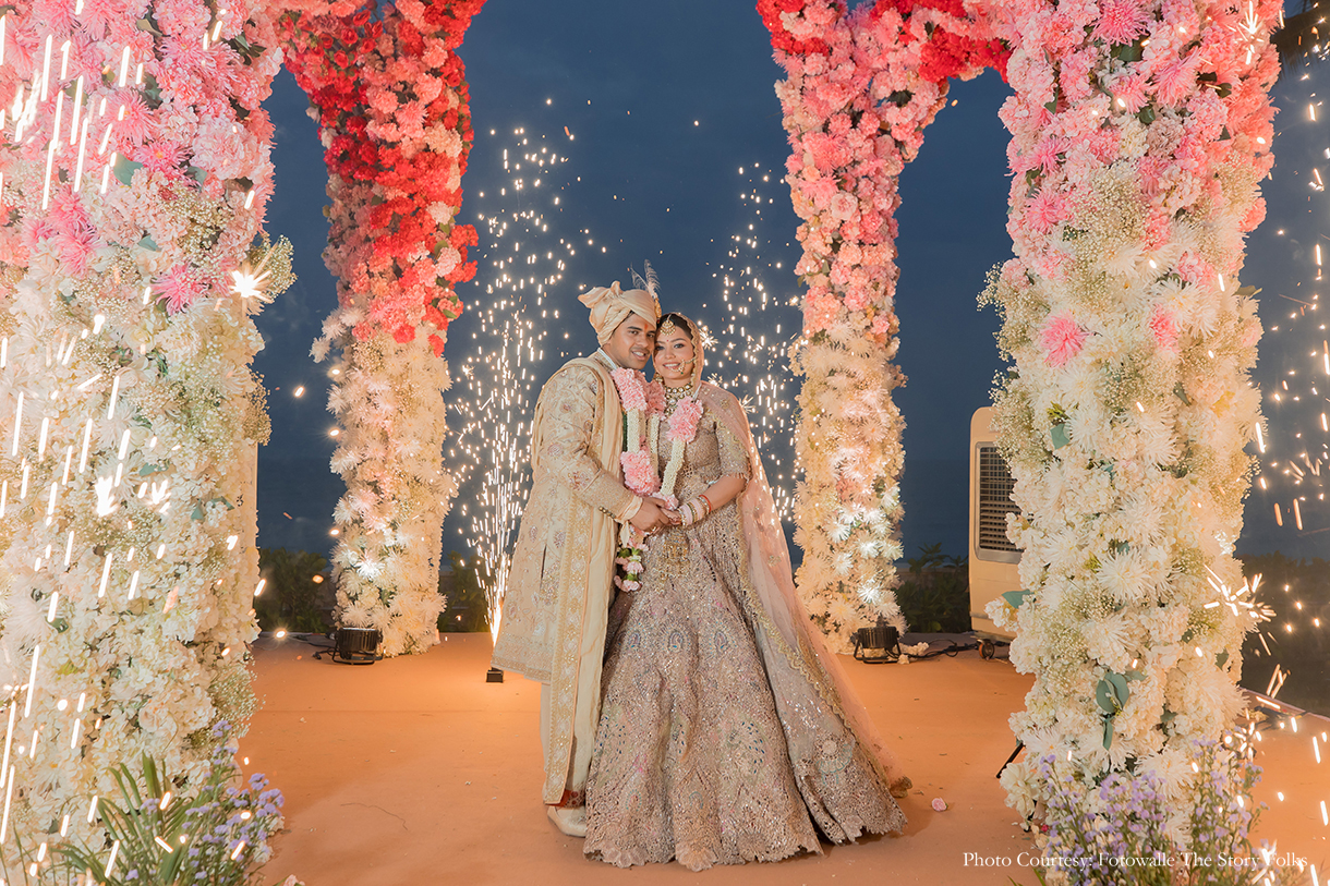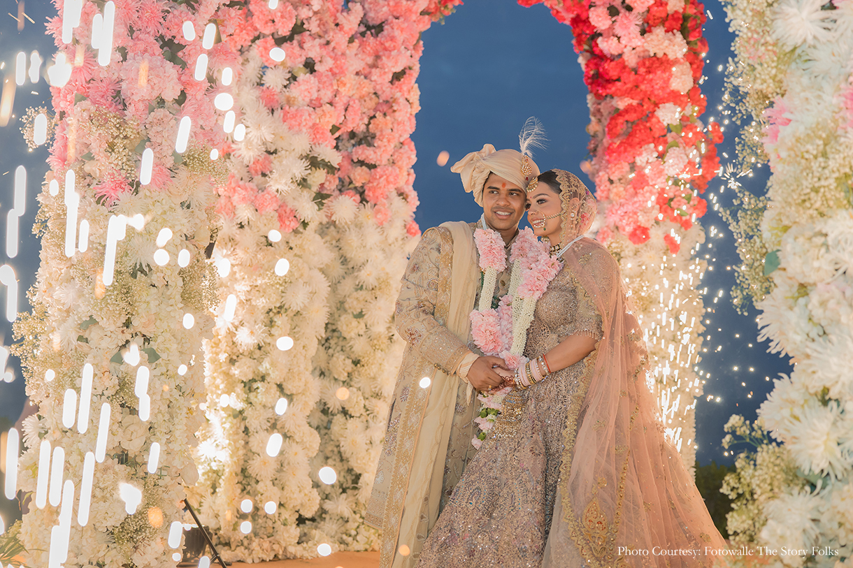 Kritika shares, “For our big day, we decided to stay true to the classics. Elegance was our topmost priority as we chose shades of pastel for the decor. Adorned with suspended soft pink blooms, pillars covered with foliage and a chrome aisle, the wedding mandap looked striking against the sunset sky.”