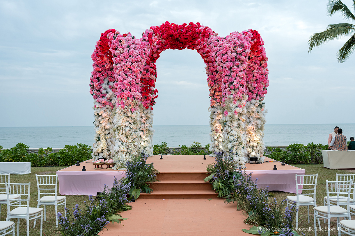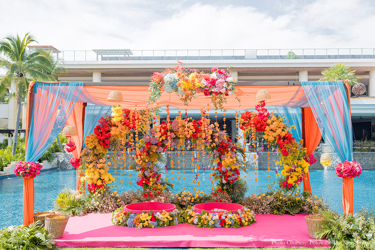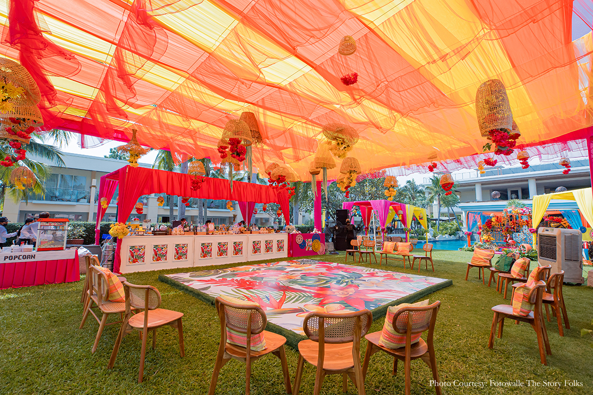 The sundowner haldi was hosted on a lawn located by the beach. Keeping the bride’s preferences in mind, the event brimmed with bright hues, floral backdrops, a vast colourful dancefloor, floral arches and a breezy canopy made up the decor. The colors looked especially bright against the white sand and light blue sea.