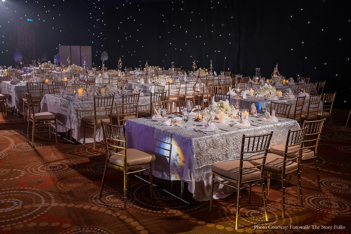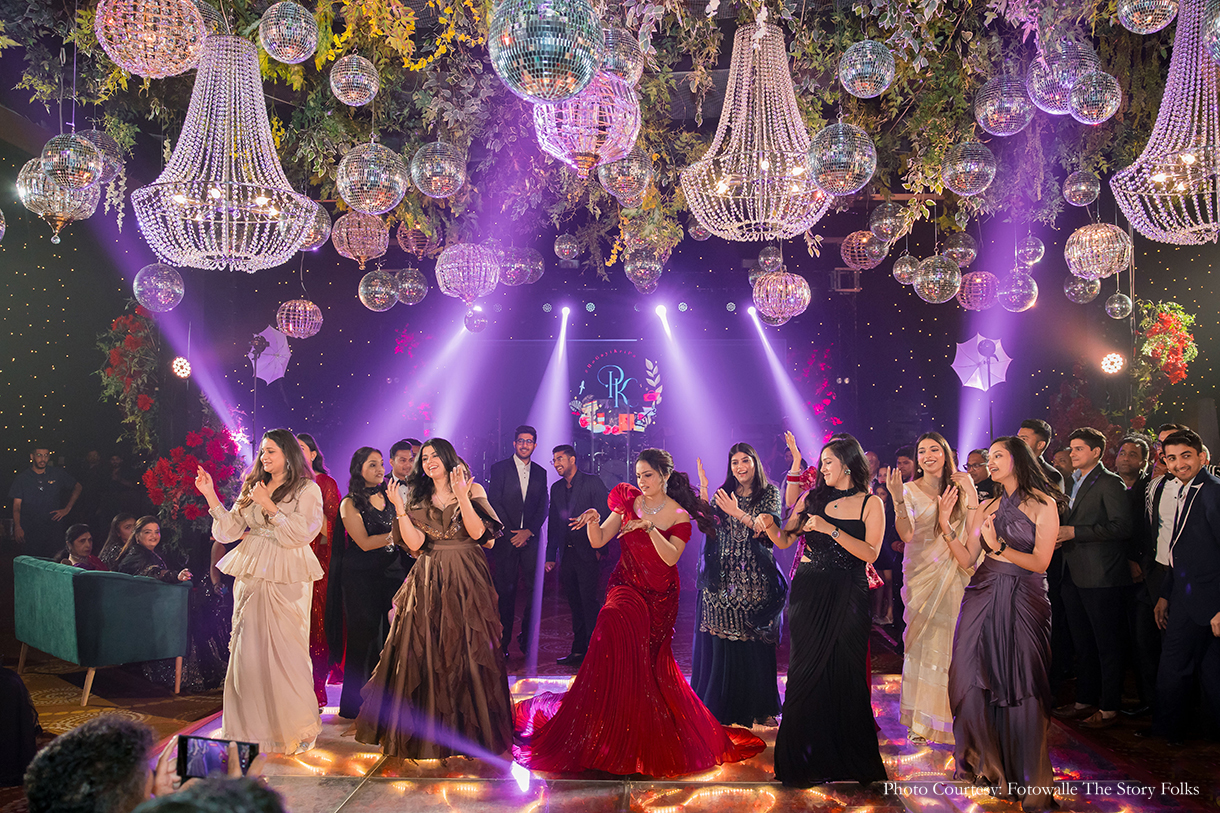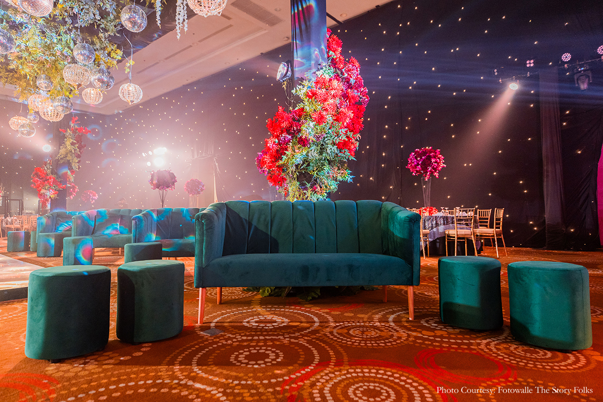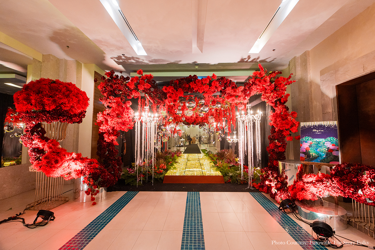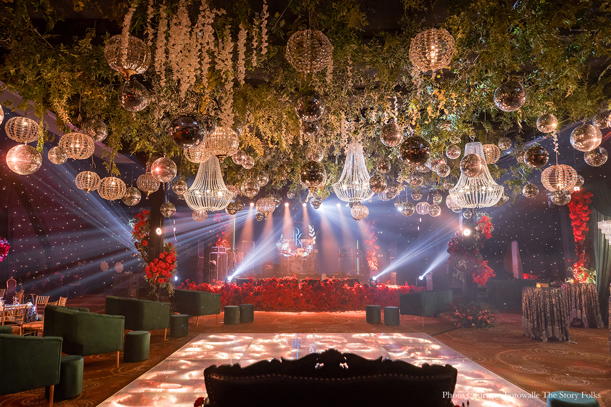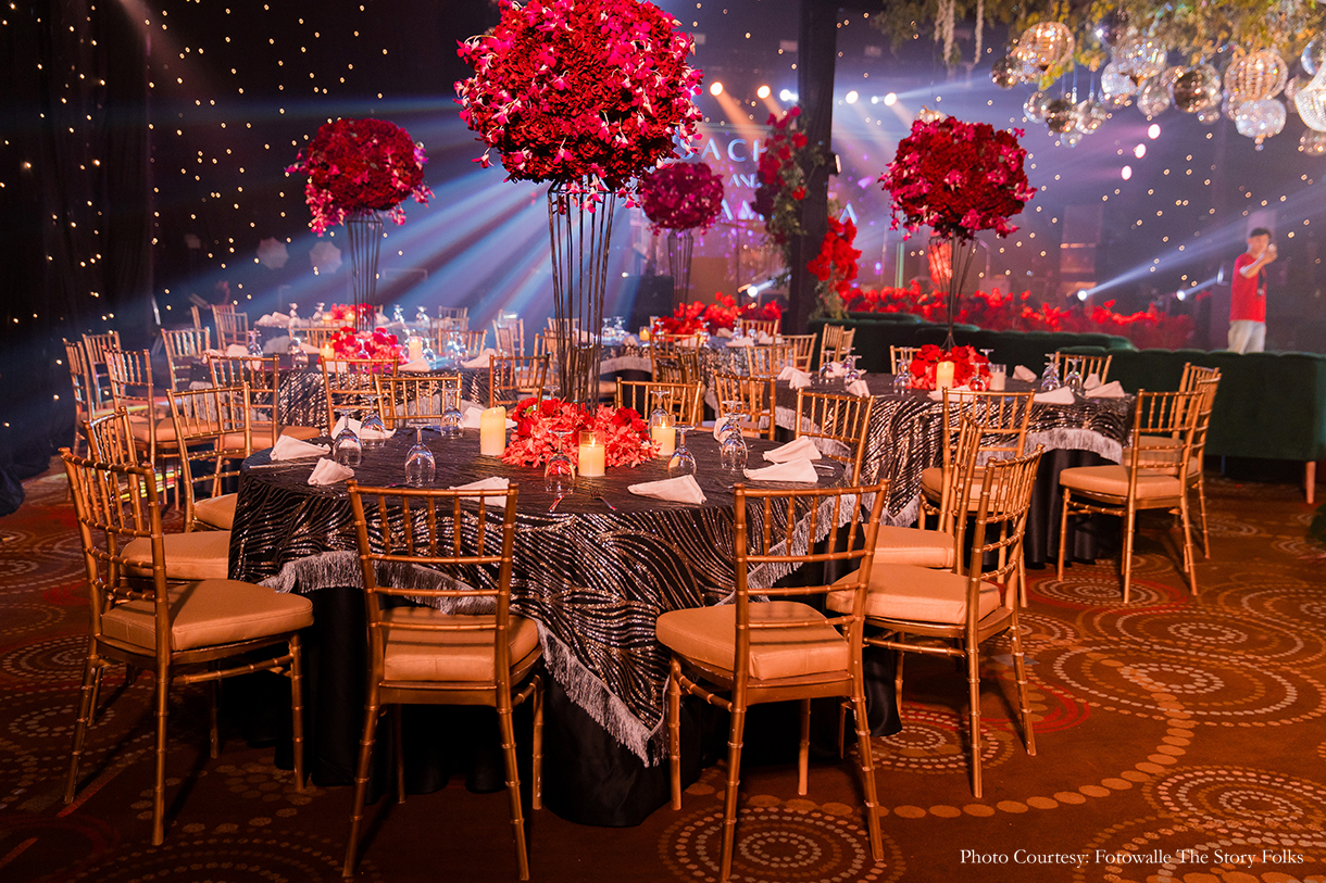 Kritika shares, “We wanted a twist to the disco theme for the cocktail night and decided to add red for the colour element. Floral arrangements and chandeliers gave it that extra oomph! Drapes in forest green contrasted the red hues while gold lights and a starry-night-like backdrop gave the entire venue a magical glow.”