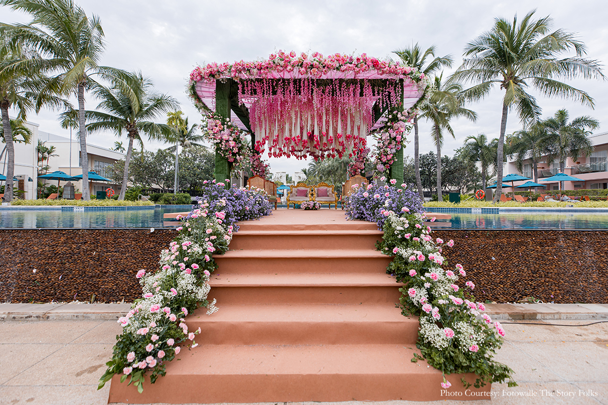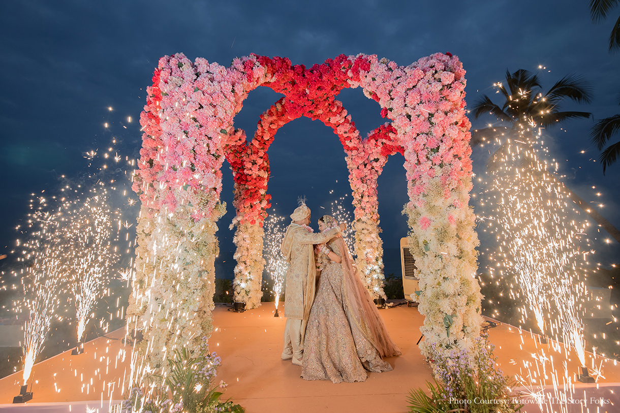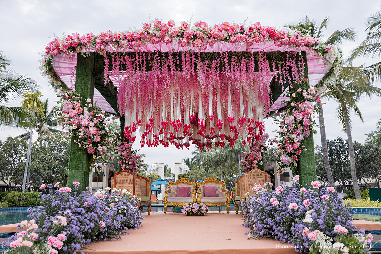 This couple’s pink wedding mandap with its foliage-adorned pillars looked striking against the sunset sky of Thailand.