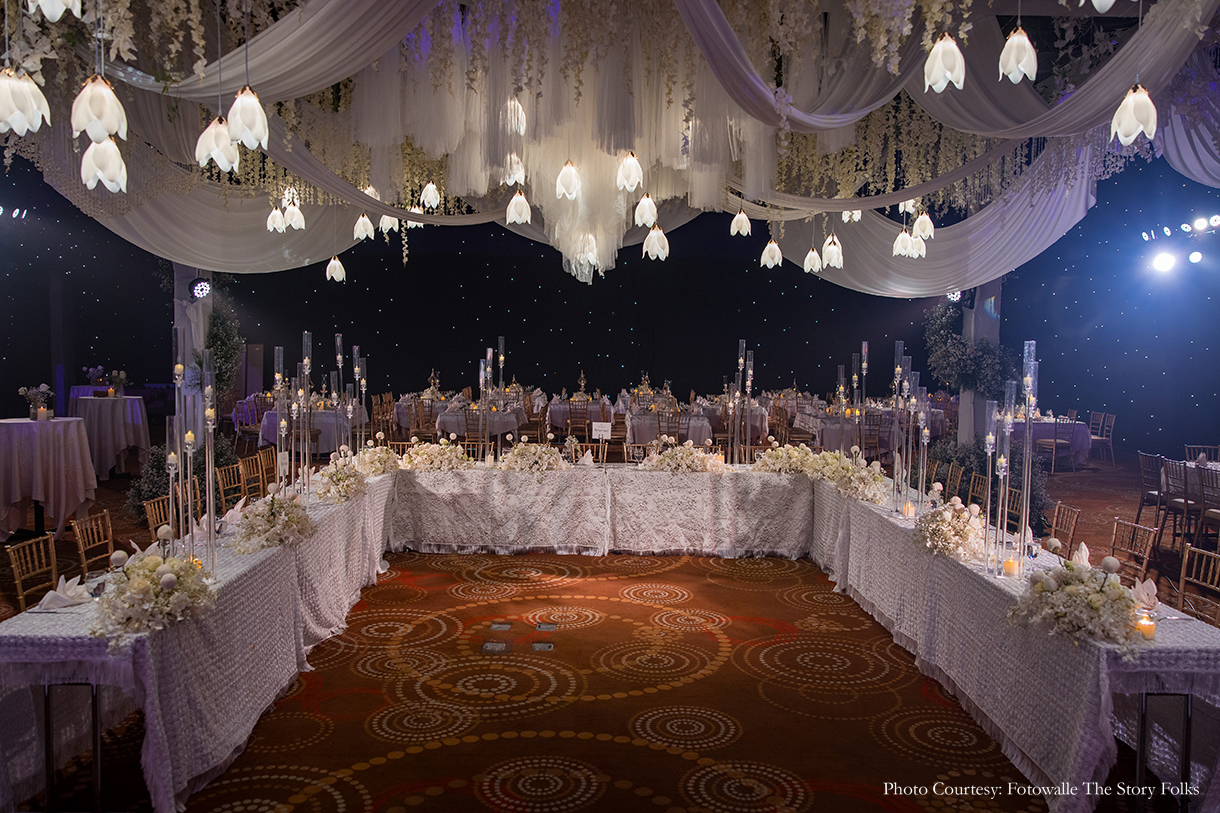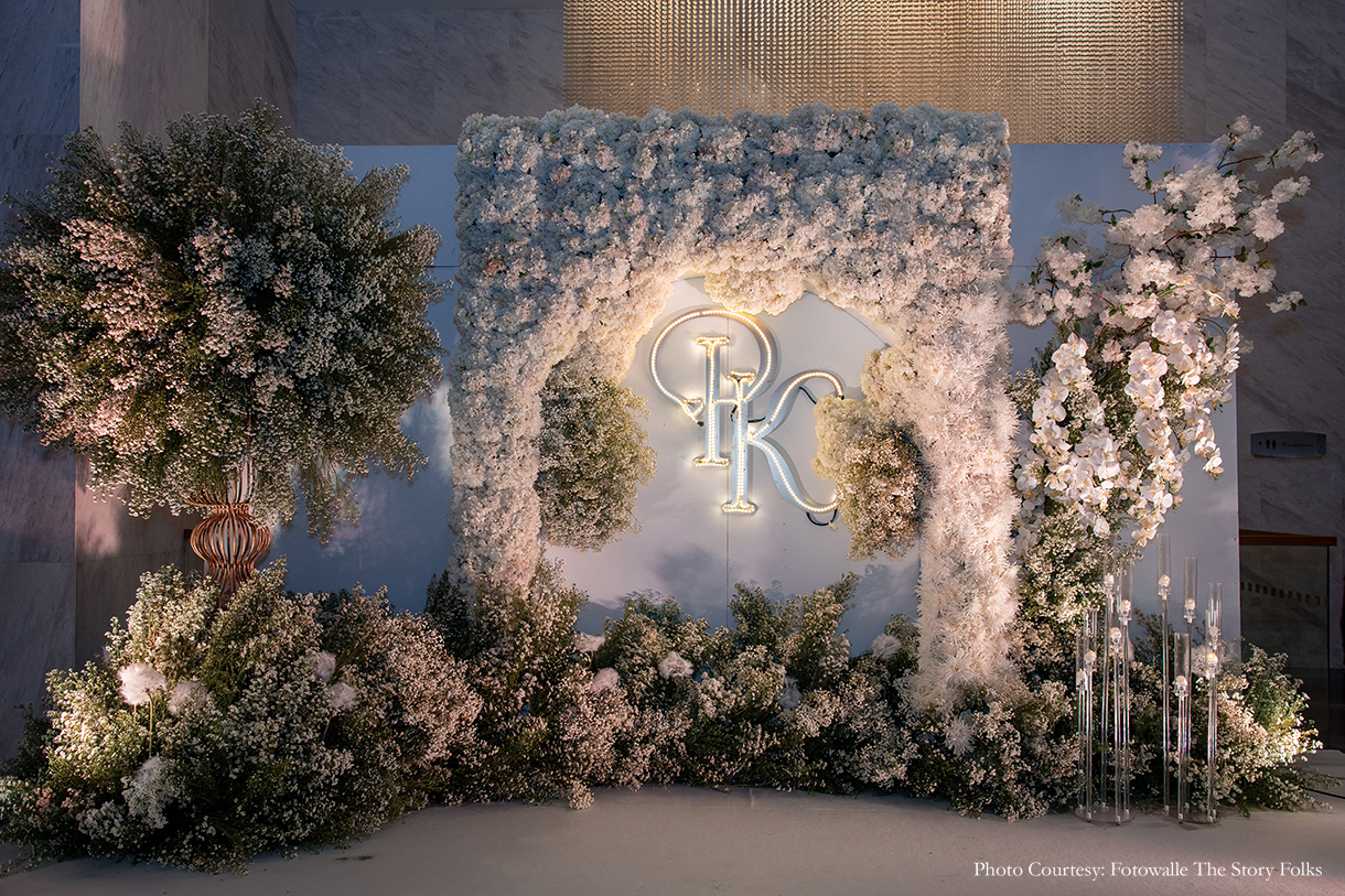 Shades of ivory, green and soft gold dominated the color palette at the reception. A foliage-filled backdrop with the couple’s monogram made the perfect photo-op for the guests before they went ahead to greet the newlyweds. Dainty gold chandeliers and lanterns played peek-a-boo in the canopy amidst the foliage bathing the venue in soft light.