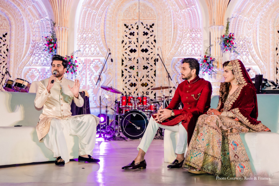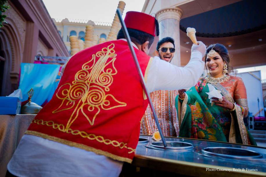 “This evening was an ode to love whose ambiance was created by soulful music as guests were welcomed with bands of fresh ‘mogras’ (jasmine blooms). Our entry for this event was extremely beautiful as we walked hand in hand with a group of graceful Arabic dancers. Shaayris, dance performances, and magic is everything this event was made of! The decor followed the Arabic theme effectively and we also arranged for a photo session, where guests could click pictures with a snake. I looked like a Mughal bride in a golden sharara by Rimple and Harpreet Narula while Ruchit was dapper in a red Shantanu & Nikhil outfit.”