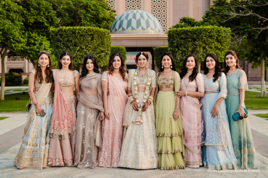 Bride’s Outfits: Swapnil Shinde (Cocktail Party), Sequins & Pearl (Kankotri Lakhvanu), Manish Malhotra (Sangeet and Mystical Night at Emirates Palace), Sabyasachi (Mehndi), Rimple and Harpreet Narula (Umrao Night), Papa Don’t Preach by Shubhika (Pool Party), Koesch By Kresha Bajaj (Wedding)